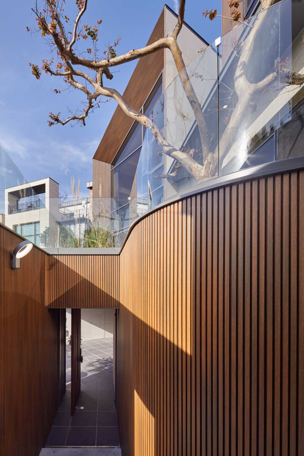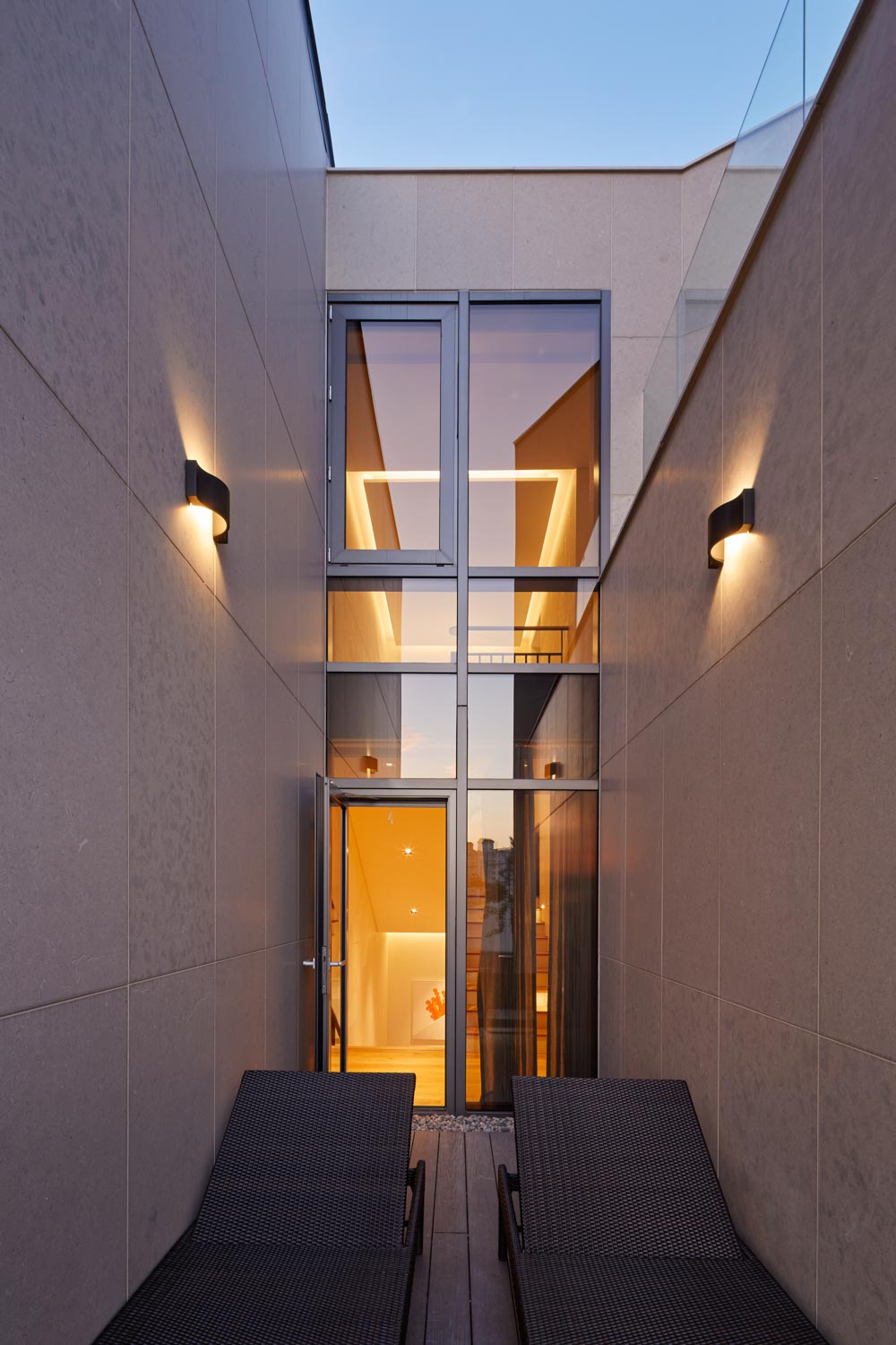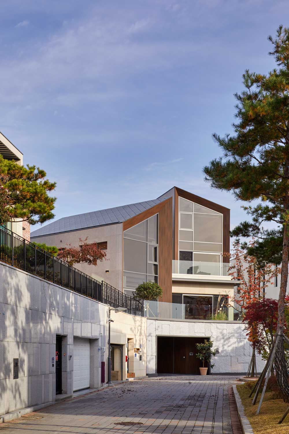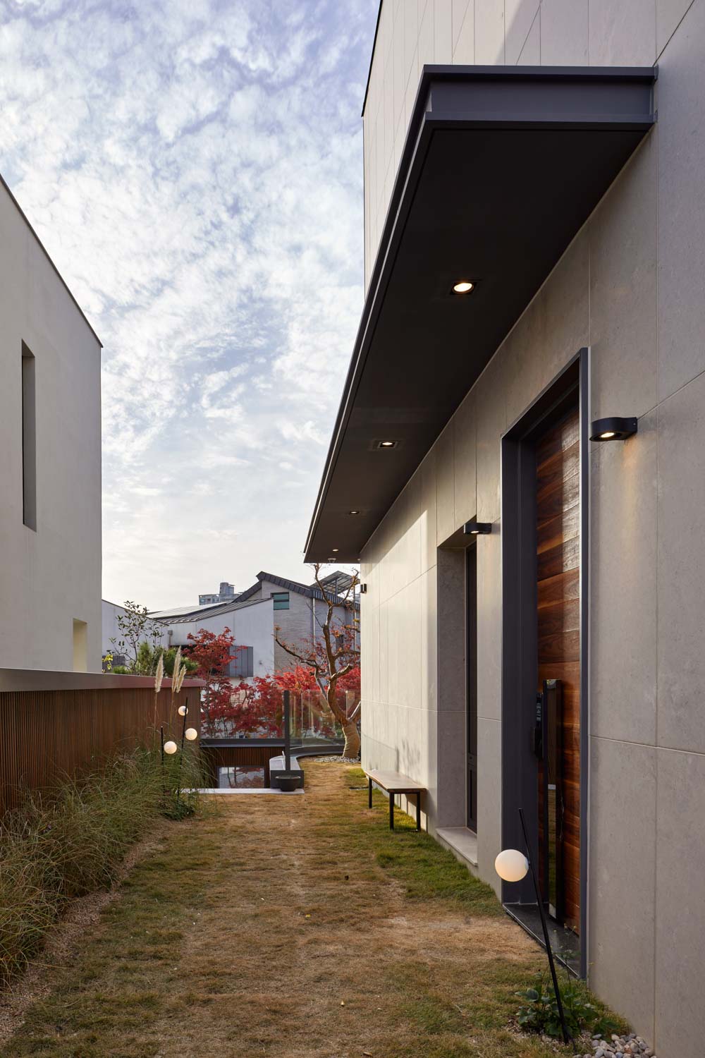 'Suwan House' is for mothers, fathers, and two daughters. The site of the house is located within the townhouse complex. A square mass was placed to fit the fan-shaped land. Various semi-external spaces such as various terraces were placed in the gap. The sunken was planned in the gap. This solves the problem of mining and ventilation underground. Underground is a space vulnerable to moisture, so a large window was planned. When all the doors of the space are opened, one movement line is planned. The large window and unblocked movement provide 'a wind path' for pleasant ventilation of the underground space. Users can directly enter the house from the basement. Three sides of the 'Suwan House' site are buried in the ground. The main gate is placed underground at the level. The spacious porch on the first floor makes it easy to store children's bicycles or a baby carriage. The living room and kitchen were planned side by side. I planned my children's playroom next to the kitchen pantry. This is a playroom for children and a space for storing toys. In the design process, the storage area was separately divided to create a pleasant living room for both parents and children. The second floor is a private area for the family. On the second floor, there are a parent's bedroom and a children's room. The areas of parents and children were completely separated so that there was no inconvenience in sharing private areas even after the two daughters grew up. The third floor is a leisure space for parents. The terrace in a different direction from the second floor was planned. An assistance kitchen was placed next to the terrace. It is a space that assists in enabling various activities on the terrace.