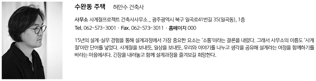 건축사와 건축주는 ‘좋은 건축’이라는 같은 목표를 향해 설계여정을 함께하는 하나의 팀이다. ‘설계’의 답은 없지만 ‘과정’에는 정답이 있다. 함께 이야기를 나누고 생각을 공유해야 한다. 과정을 잘 축적해 완성된 건축 안에서 건축주가 평안을 느낄 때, 비로소 우리의 작업에 진정한 의미가 부여된다고 생각한다.
