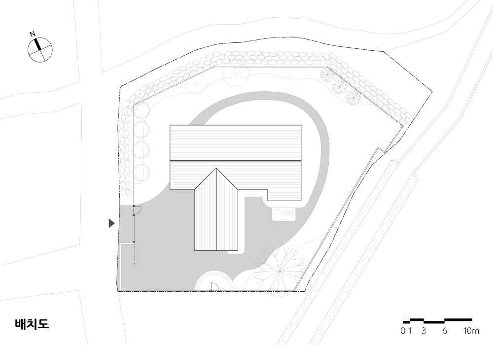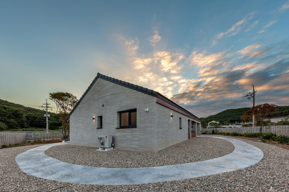 전체적인 매스는 가운데 중정을 품은 단층의 ‘ㅜ+ㄷ’자 형이다. 거실을 중심으로 양옆엔 길고 작은 매스를 배치하여 중정을 만들었다. 건물은 대지 가운데 배치하고, 건물 주변으로는 원형의 산책로를 계획하여 중심의 주택을 고스란히 감상할 수 있도록 하였다. 이는 넓은 여백을 사색하듯 움직임의 선으로 채우는 요소이기도 하다. 건축주가 요구한 기와는 평기와로 제안하여 현대적 느낌의 한옥에 다가서려 했다.