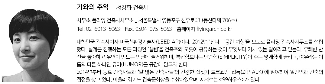 | 기와의 추억 설계자 | 서경화 _ 플라잉 건축사사무소 건축주 | 윤팔중자 감리자 | 서경화 _ 플라잉 건축사사무소 시공사 | 윈윈하우징 대지위치 | 인천광역시 강화군 내가면 강화서로 225번길 17 주요용도 | 단독주택 대지면적 | 1,269.00㎡ 건축면적 | 191.62㎡ 연면적 | 191.62㎡(용적률 산정면적 : 164.25㎡) 건폐율 | 15.10% 용적률 | 12.94% 규모 | 1층 구조 | 철근콘크리트구조 + 중목구조(지붕) 외부마감재 | 모노타일(오석 클래식) 내부마감재 | 도배지, 원목마루, 편백나무, 타일 설계기간 | 2020. 06 - 2020. 11 공사기간 | 2020. 12 – 2021. 08 사진 | 권기돈 전문기술협력 - 구조분야 : (주)두항구조안전기술사사무소 - 기계설비분야 : (주)코담기술단 - 전기분야 : 제이앤영 |