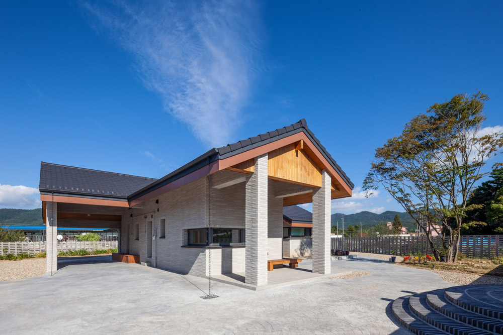 Overall, the roof is in the form of a gable and the exterior material is gray monotile to remind of a calm hanok. This place, which determines the first impression of the entire building, is an outer and internal transition space, and as a non-conforming outer space, it tried to metaphorically show the lives of old couples in a gentle but intense and powerful images.