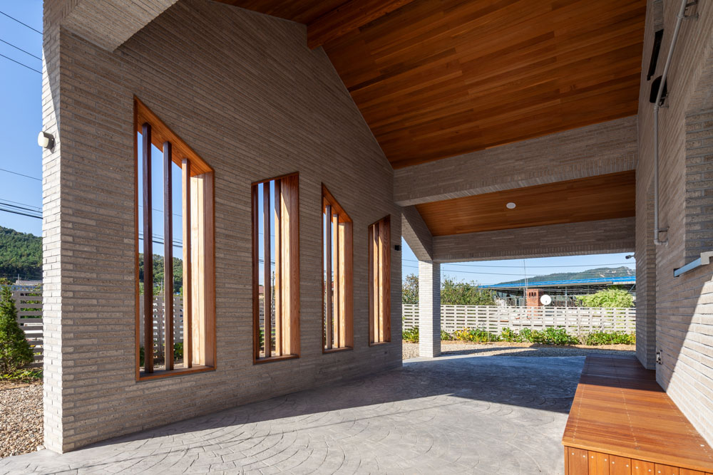 전반적으로 차분한 느낌의 한옥이 연상되도록 지붕은 박공형태를, 외장재는 회색의 모노타일을 적용하였다. 건물 전체의 첫인상을 좌우하는 이곳은 외부이면서 내부의 성격을 지닌 전이 공간인데, 비를 맞지 않는 외부공간으로서 온화하지만 강렬하고 굳건히 구축된 모습으로 노부부의 삶을 은유하듯 보여주려 했다.