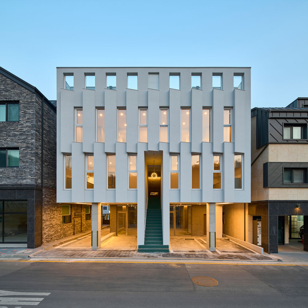 In a site surrounded by neighboring buildings on three sides, it is almost impossible to satisfy all of the programs and parking. In a typical design process, the primary program housing would come first followed by convenient parking layout and a café. We, nevertheless, came up with an alternative to overcome the constraints. The white curtain catches passersby’s attention and the small front yard and a concrete bench for the public is designed for the café placed sitting further from the street. We imagined that it would become a small gathering space for group of local residents
