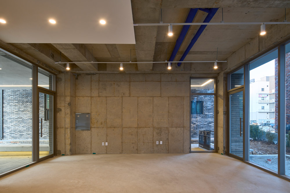 In a site surrounded by neighboring buildings on three sides, it is almost impossible to satisfy all of the programs and parking. In a typical design process, the primary program housing would come first followed by convenient parking layout and a café. We, nevertheless, came up with an alternative to overcome the constraints. The white curtain catches passersby’s attention and the small front yard and a concrete bench for the public is designed for the café placed sitting further from the street. We imagined that it would become a small gathering space for group of local residents
