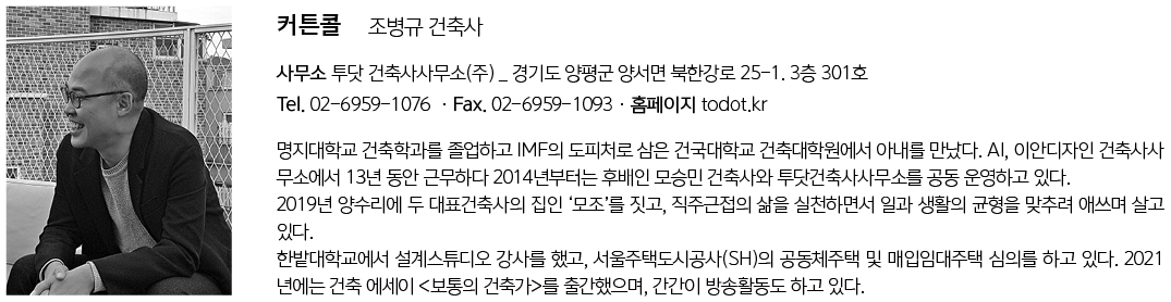 1년 전 도시계획가를 꿈꾸는 앳된 고3 학생이 부모님과 함께 투닷을 찾아왔다. 집 지을 곳과 그 집의 설계를 맡을 건축사 물색에 주도적으로 관여해왔던 아들의 열정과 지식은 나이로만 판단했던 꼰대의 자세를 바로잡게 했고, 우리에게 좀 더 도전하기를 바라는 열린 마음에 큰 자극을 받았더랬다.