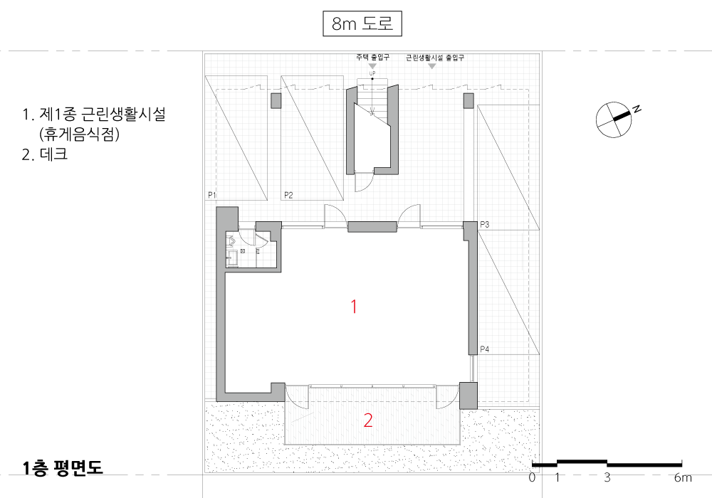 - 삼면이 집으로 둘러싸이고 겨우 한 면만 도로에 면한 상황에서 주택, 상가, 주차를 모두 만족시킬 수는 없다. 내 집으로 가는 길이 우선이고, 그다음이 사용하기 편리한 주차장이며, 상가는 마지막이다. 그럼에도 불구하고 그 약점을 극복할 대안이 필요하다.