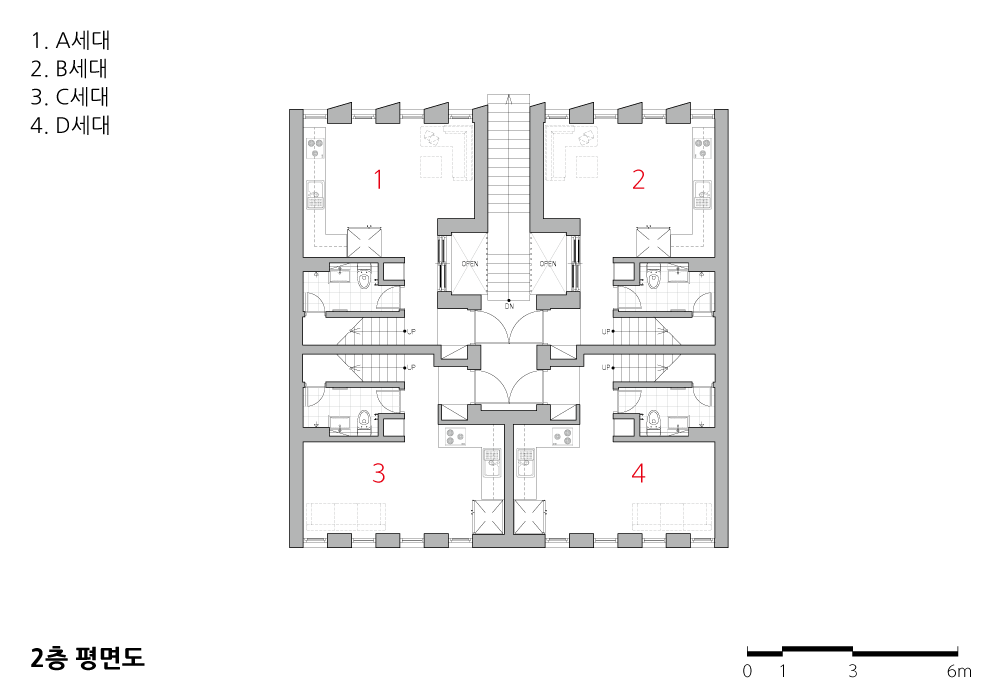 - 복층으로 구성된 네쌍둥이 같은 4가구를 계획하였다. 네 집 모두 2층에서 출입하게 되어 엘리베이터 배제가 합리적 선택지가 되었고, 모든 집이 다락과 옥상정원을 가질 수 있어 임대인과 임차인의 위계를 지우고 동등한 거주 환경의 물리적 조건을 만족하게 했다.