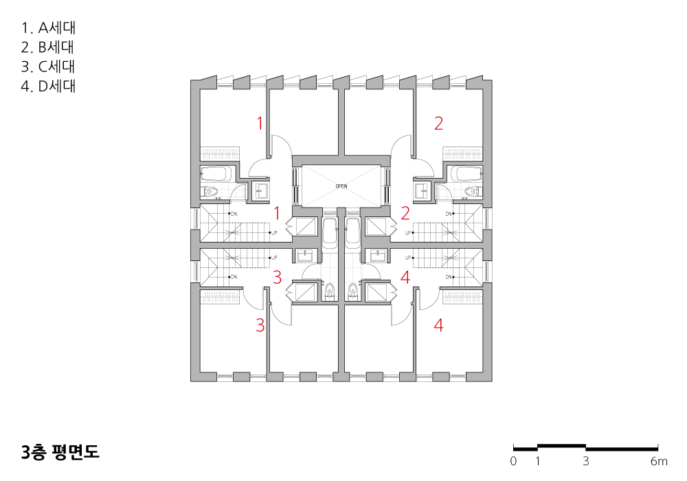 - 입지 조건, 지역의 상황을 고려했을 때, 3~4인 가족을 대상으로 하는 주거의 형태가 적합할 것으로 판단하여 3룸 구성의 4가구로 가구 수를 결정하였다.