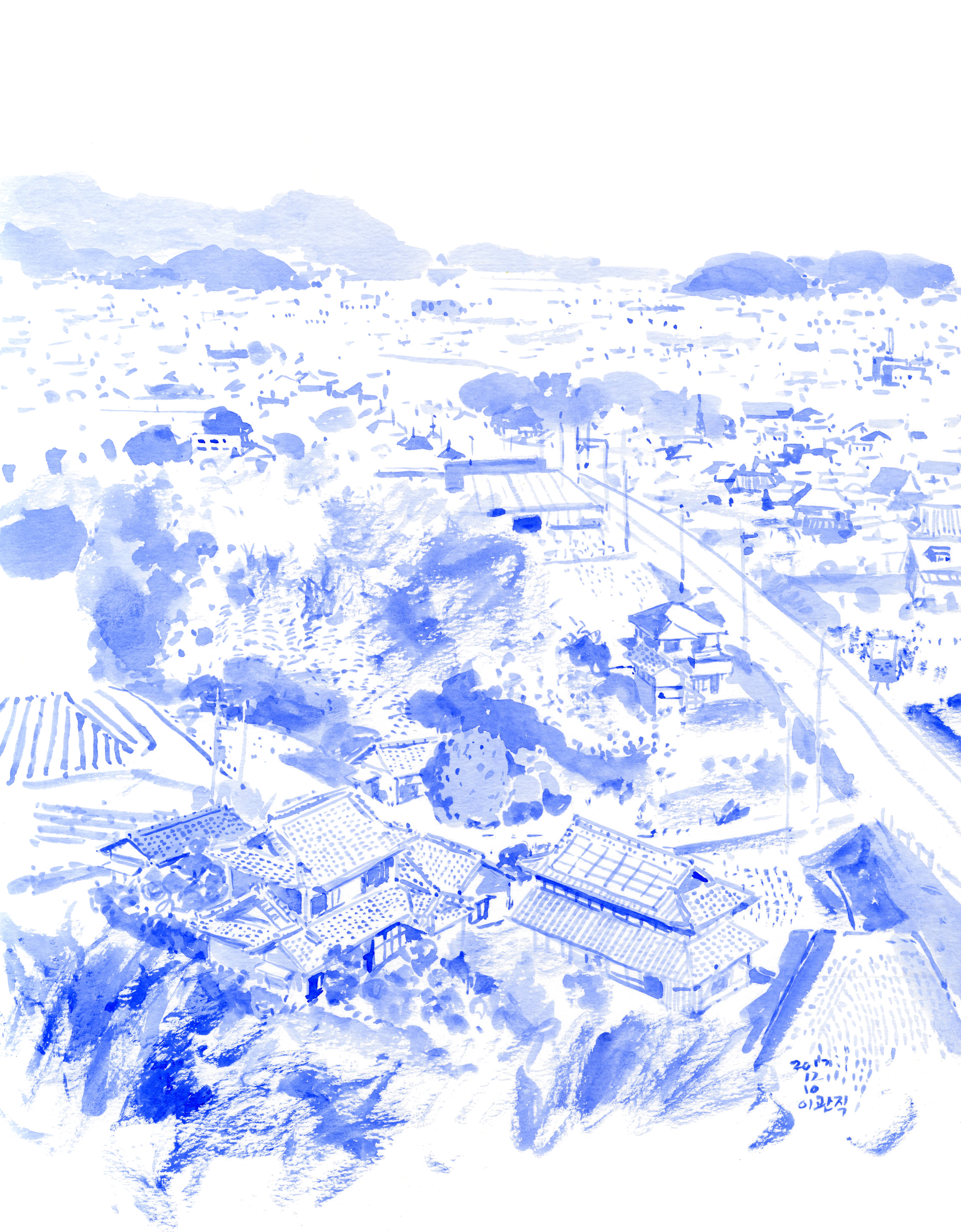 일본 세토내해(瀬戸内海) 지역을 여행하며 다카마츠 공항호텔(高松空港 Tagamatsu Apa Hotel)에서 하루를 묶었다. 낯선 곳에서의 여행 중 아침은 더욱 새롭다. 호기심 속에 여명이 시작되고 세상은 서서히 어두운 푸른 빛 속에서 자신의 속살을 보인다. 다행히도 숙소의 전망이 좋아, 낯선 마을 그리고 멀리 펼쳐진 들을 바라 볼 수 있었다. 일본 마을 풍경은 어디나 경관이 조절되어 있다. 개별적인 건물, 조합되어 배치된 모양새, 주변의 나무와 조경 모두가 다듬어져 있다. 심지어 자연스럽지 않을 정도로 말이다. 미관이나 경관이라는 용어 자체도 일본에서 개념화된 것이니, 그들의 시각적 풍경을 조절하려는 노력이 얼마나 대단한지 알 수 있다. 깨끗하고 정돈된 마을을 내려다보면서 낯선 느낌을 붓으로 옮겨본다.