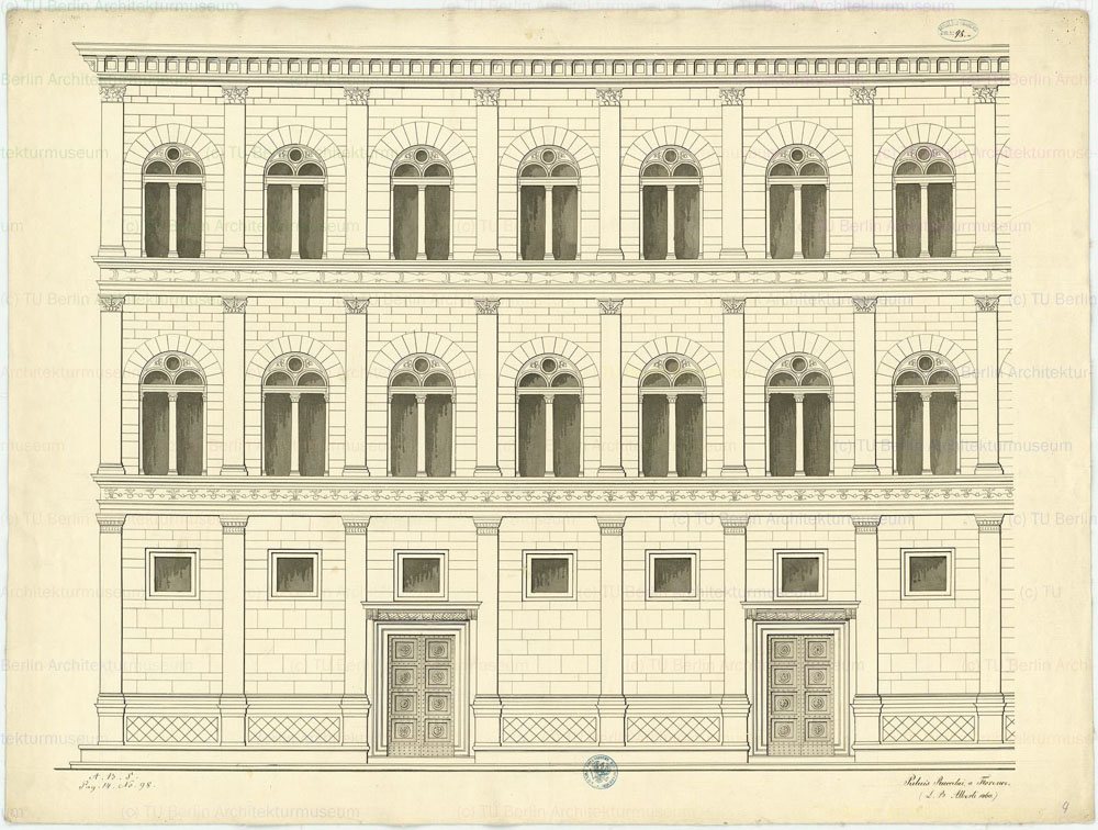 건축에서도 이와 비슷한 사례는 얼마든지 있을 것이다. 내가 알고 있는 역사적인 사례는 르네상스 시대의 건축가인 레온 바티스타 알베르티가 디자인한 루첼라이 궁이다.<사진 8> 이 궁의 파사드를 보면, 8개의 벽기둥이 규칙적인 간격으로 나 있고, 기둥과 기둥 사이 벽에는 창문이 하나씩 뚫려 있어서 창문 또한 아주 규칙적인 간격으로 7개가 있다. 전체적으로 이 건물의 파사드는 대단히 규칙적이고 통일되어 있다. 이 건물이 주는 미적 가치는 바로 이런 수학적인 규칙성과 통일성에 있다고 할 수 있다. 오늘날의 매끈한 유리 커튼월 빌딩의 멀리언 간격을 보는 듯하다. 하지만 루첼라이 궁에는 거짓이 있다. 1층에 있는 두 개 문 위의 창문은 사실 가짜다. 그 안쪽은 구멍이 뚫리지 않은 벽이지만, 디자인의 통일과 창문의 규칙적인 리듬을 살리고자 가짜로 창문 모양을 넣어준 것이다. 창문뿐만 아니라 규칙적 벽기둥 역시 진짜 기둥이 아니므로 그 안의 구조는 밖에서 보는 것과 전혀 다르다. 기둥 위에 새겨진 엔타블러처, 즉 1층과 2층, 2층과 3층을 구분하는 가로의 장식 부분 역시 건물의 실제 구조와는 무관하게 디자인된 것이다. 알레르티에게는 건물의 실체와 기능보다 눈에 보이는 미적 효과가 훨씬 더 중요한 것이었다.