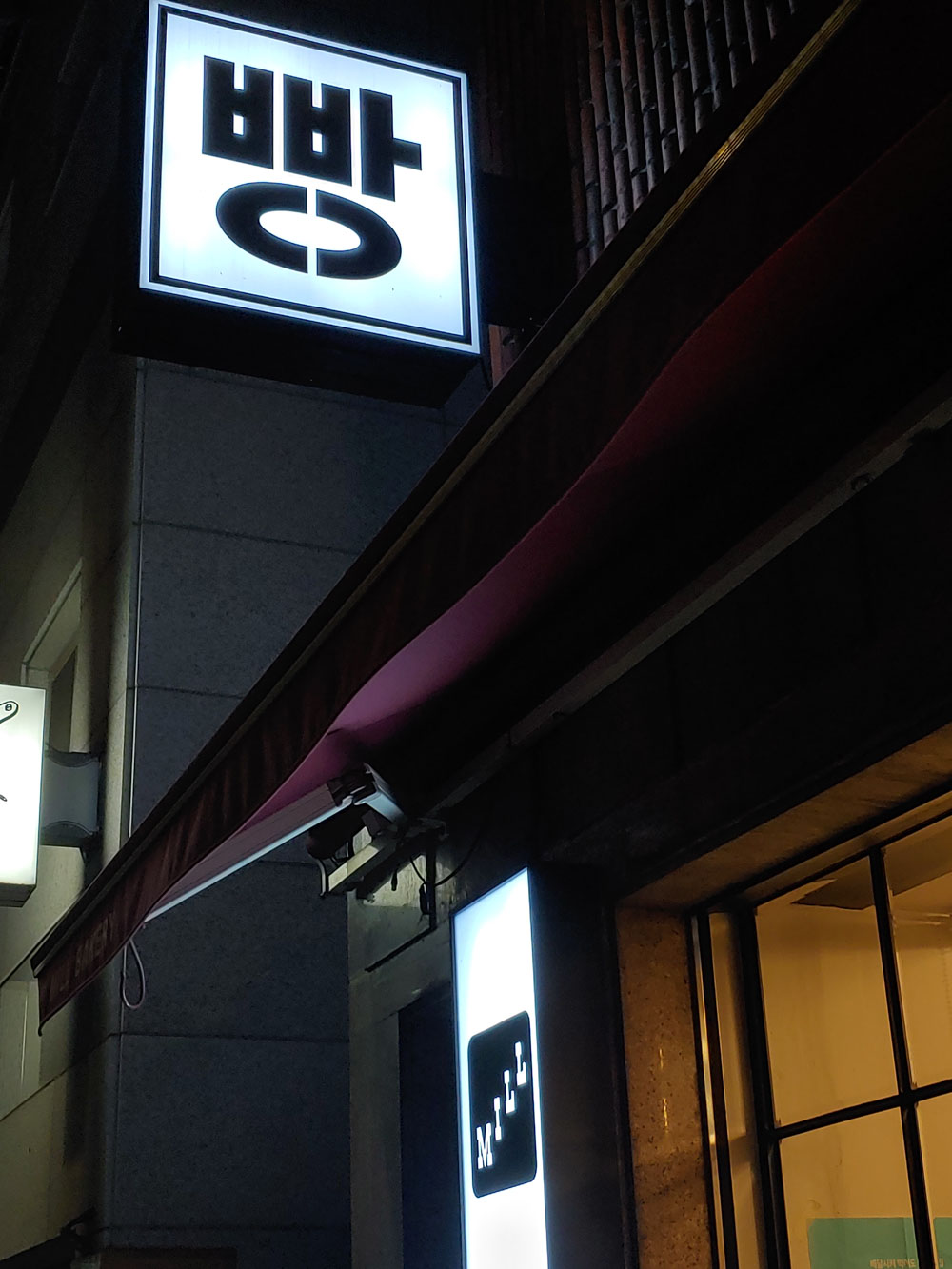 이 대칭성이라는 것은 규칙성과 통일성, 균형의 다른 이름이다. 대칭이라는 것은 오른쪽과 왼쪽, 위쪽과 아래쪽이 똑같다는 뜻인데, 그것은 모든 것이 통일되어 있다는 것이다. 따라서 스텐실 글씨가 카운터가 있건 없건 모든 글자에 브릿지를 넣어주는 것, 그리고 알레르티가 벽에 구멍이 있건 없건, 건물 내부의 구조가 어떻든 간에 건물의 파사드에 시각적인 규칙성과 통일성을 부여하는 것은 똑같이 대칭을 만들고자 하는 태도의 발현인 셈이다. 나는 내가 사는 동네 빵집의 간판을 보면서 감탄한 적이 있다.<사진 9> 빵이라는 글자가 있는데, 옆으로 넓게 퍼진 받침 ㅇ에 브릿지를 넣어 스텐실 글자처럼 보이게 했다. 그렇다면 쌍자음 ㅃ의 닫힌 공간에도 브릿지를 넣어주어야 통일성이 있는 것 아니겠는가? 하지만 이 간판은 스텐실을 채택한 것이 아니다. 이 글자를 보면 상당히 볼드해서 ㅂ의 속 공간의 면적이 아주 작은 것을 볼 수 있다. 따라서 이렇게 폭이 좁은 공간에 또다시 브릿지를 넣는 건 복잡성을 높일 뿐이다. 스텐실 글자를 만들 의도가 없었는데, 왜 ㅇ에는 브릿지를 넣어주었을까? 그것은 가운데 ㅂ자 속 공간의 얇은 흰색 배경의 수직적 연속으로 ㅇ에도 길을 터준 것이다. 또한 이 글자는 쌍ㅃ의 ㅂ과 ㅂ사이, 그리고 가운데 ㅂ과 ㅏ사이에 동일한 간격의 흰색 배경 공간이 있다. 이것과 동일한 성질을 받침에도 균질하게 넣어준 것이다. 이것은 디자이너가 빵이라는 글자의 위아래를 대칭적으로 만들어주고자, 다시 말해 규칙성과 통일성을 적용하고자 디자인한 것이다. 스텐실 글자를 만들고자 한 결과가 아니다. 사실 ㅇ에 넣은 흰색 길(브릿지)이 없어도 가독성에는 아무런 문제가 없다. 하지만 사람이란 이처럼 무의식적으로 대칭과 균형의 강박에 시달리도록 프로그래밍된 것이다. 통일성을 지향하는 디자인은 그러한 프로그래밍의 발현이라고 할 수 있다.