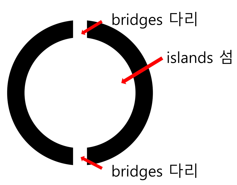 스텐실 기법의 묘미는 폐쇄된 글자에서 나온다. 폐쇄된 글자란 영문의 A, B, D, O, P, Q, R처럼 폐쇄된 공간(타이포그래피에서 이 공간을 카운터[counter]라고 부른다)을 갖는 글자들이다. 한글에서는 ㅁ, ㅂ, ㅇ, ㅍ, ㅎ이다. 다른 글자를 만들 때는 그냥 모양대로 구멍을 파내면 된다. 하지만 O의 경우 구멍을 파내면, <사진 2>의 왼쪽의 결과를 얻어야 하는데, 실제로는 오른쪽의 결과가 나온다. 글자의 윤곽을 살려내려면 <사진 3>에서 보는 것처럼 브릿지(bridges)와 아일랜드(islands)의 개념으로 구멍을 파내야 하는 것이다. 이 개념도를 보면 마치 글자의 윤곽은 강이고, 그 강을 건너는 다리가 있고, 그 안의 카운터 공간은 섬처럼 묘사되는 것을 볼 수 있다. 이 브릿지와 아일랜드의 존재가 바로 스텐실 글자의 묘미이자 매력이다. 스텐실 글씨는 특정한 서체가 아니므로 반드시 이 브릿지가 보여야 스텐실 글씨로 인식된다. 그에 반해 브릿지가 반드시 필요한 경우는 위에서 언급한 것처럼 카운터가 있는 문자들이다. 영문의 C나 E, 한글의 ㄱ이나 ㄴ은 카운터 공간이 없으므로 굳이 브릿지가 필요 없다. 영문이나 한글이나 카운터가 없는 문자가 훨씬 더 많다. 게다가 한글의 경우 모음은 폐쇄된 부분이 하나도 없다. 따라서 브릿지가 필요한 경우는 제한적이라고 할 수 있다.