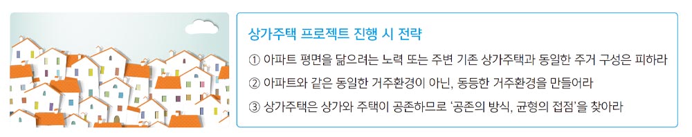 아파트의 평면을 따른다고 해도 입지의 여건과 거주 환경으로 인해 결국 아파트의 아류, 또는 하위 수준일 수밖에 없으며, 주변의 상가주택과 동일한 주거 구성으로는 이른바 시세라는 틀에서 벗어날 수 없다. 오히려 단독주택을 닮으려 노력하거나, 주변에 없는 새로운 주거 구성을 시도하는 것이 아파트와 경쟁할 수 있고, 시세에서 벗어나 임대수익을 주도할 수 있는 여지가 생긴다.