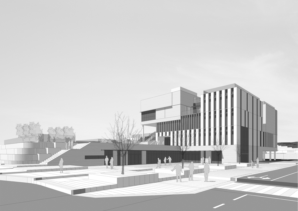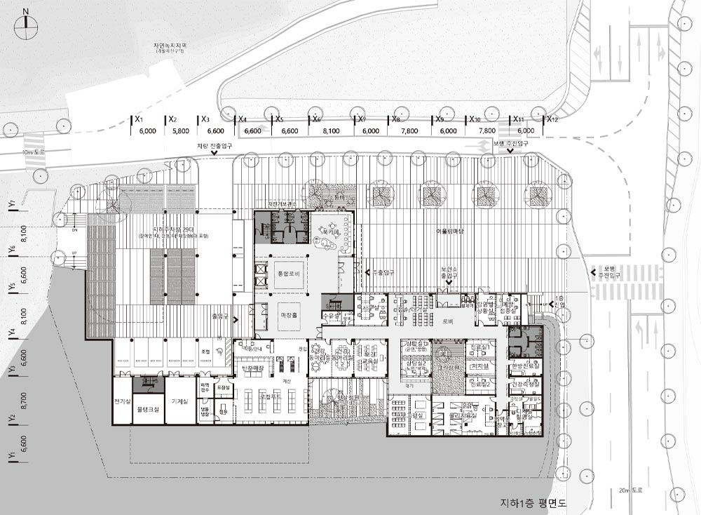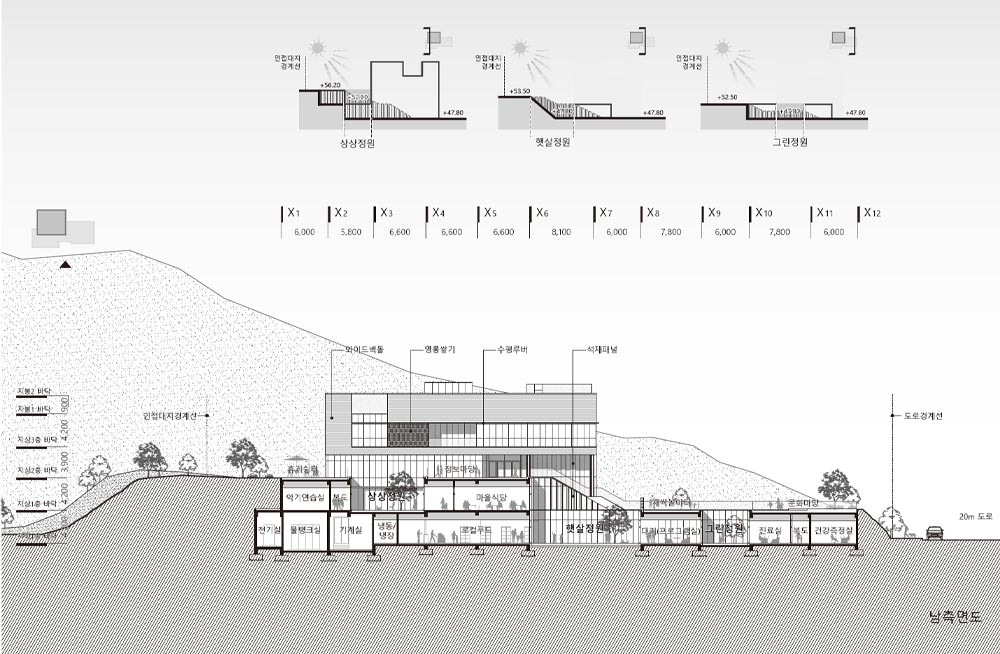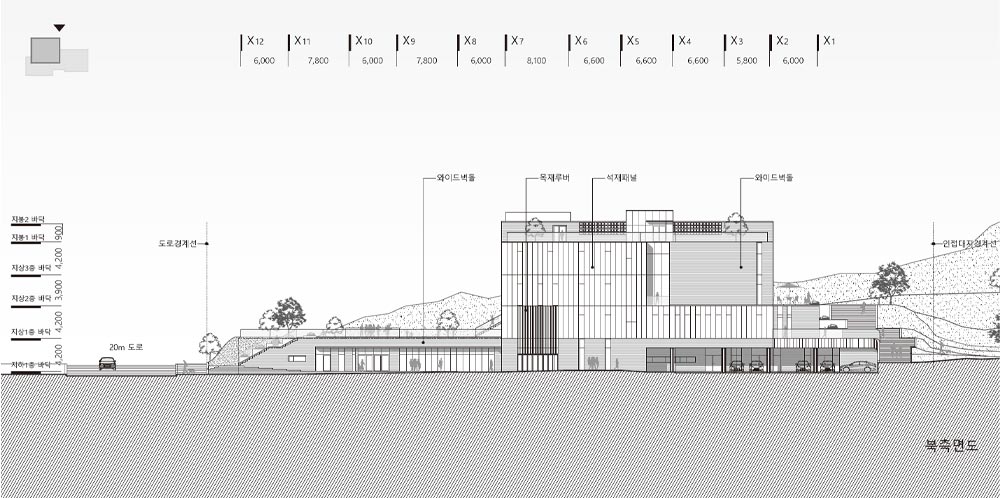 3개 레벨의 건축화된 대지는 각 층과 바로 연결되고, 지면과 접하는 시설의 환경성을 위해 지형을 이용한 크기와 깊이가 다른 선큰 정원을 각 레벨에 계획하고 프로그램을 연계하였다. 각 플랫폼과 직접 연결된 지상 매스는 정연한 형태로 계획하고, 각 레벨과 만나는 부분을 오픈하는 볼륨 디자인으로 깊이감 있고 담백한 입면으로 구성하였다.