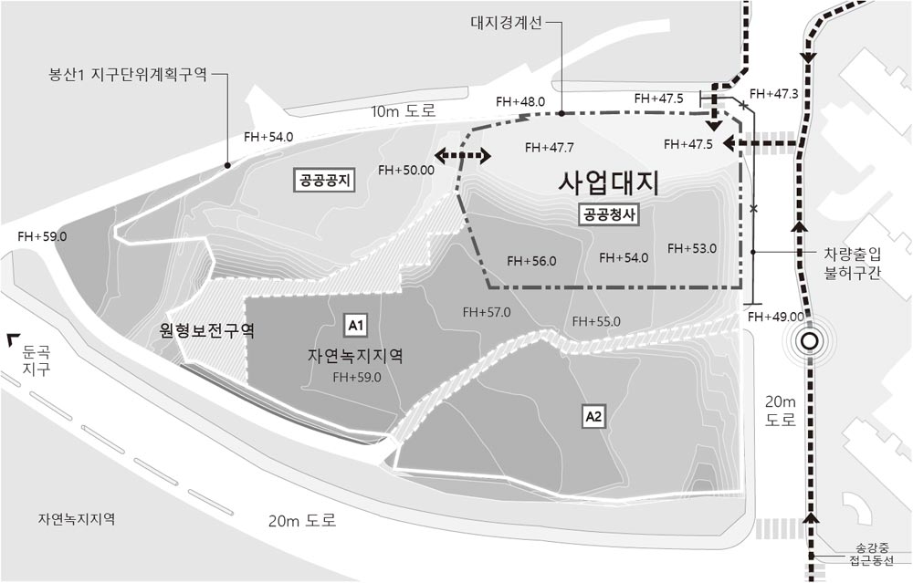 대지는 건폐율 20%, 대지 고저차가 5~8미터인 경사지형이다.