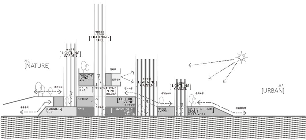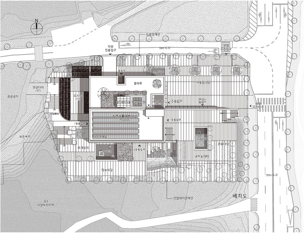 건폐율과 넓은 대지 조건을 적극적으로 이용하여 기존 지형을 건축 내외부와 엮는 대지의 건축화를 제안하였다. 건축과 외부가 접하는 면이 넓어지고 다양한 레벨에서의 접근이 쉬운 마당으로 디자인된 랜드스케이프 플랫폼은 복합용도로 구성된 시설의 접근 편의성과 일상의 확장으로 자연스러운 만남이 많아지는 마을의 새로운 공공허브이다.