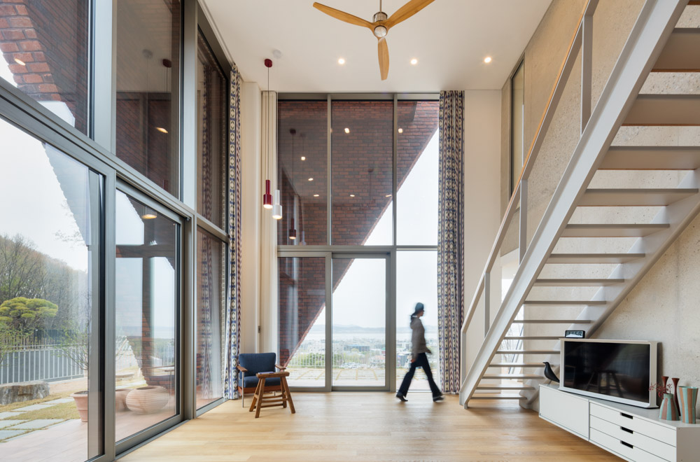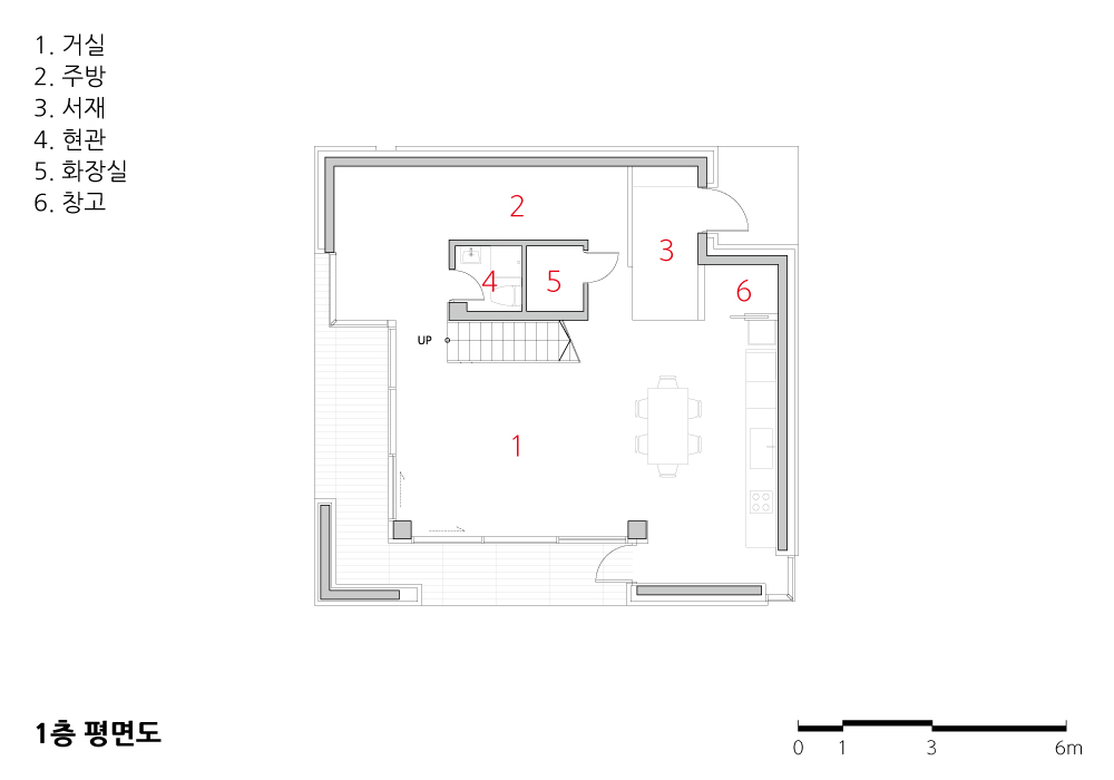 복층의 거실과 서재, 그리고 주방은 가변적이며 유동적인 공간으로 계획되어있다.