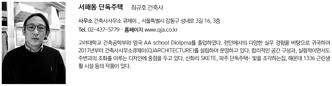 | 서패동 단독주택 설계자 | 최규호 _ 건축사사무소 큐제이 감리자 | 최규호 _ 건축사사무소 큐제이 시공사 | 이디포건설 설계팀 | 박증혜 대지위치 | 경기도 파주시 서패동 주요용도 | 단독주택 대지면적 | 400.00㎡ 건축면적 | 97.54㎡ 연면적 | 136.50㎡ 건폐율 | 24.36% 용적률 | 31.31% 규모 | 2층 구조 | 철근콘크리트구조 외부마감재 | 치장벽돌(브릭코 넬리센) 내부마감재 | 노출콘크리트, 수성페인트 설계기간 | 2017. 07 - 2018. 02 공사기간 | 2018. 04 - 2018. 10 사진 | 신경섭 전문기술협력 - 구조분야 : 다우구조연구소 - 기계설비분야 : 정연엔지니어링 - 전기분야 : 정연엔지니어링 - 소방분야 : 정연엔지니어링 |
