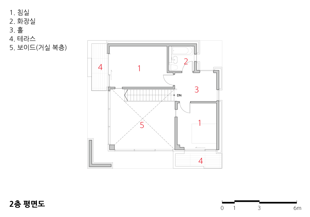 2층의 방들은 1층과 분리되어 있는 지극히 개인적인 공간이다. 그러면서도 작은 창을 통해서 원할 때는 거실에서 일어나는 일과 소통할 수 있고, 외부 테라스를 통해서 마당의 일을 볼 수 있는 곳이다.