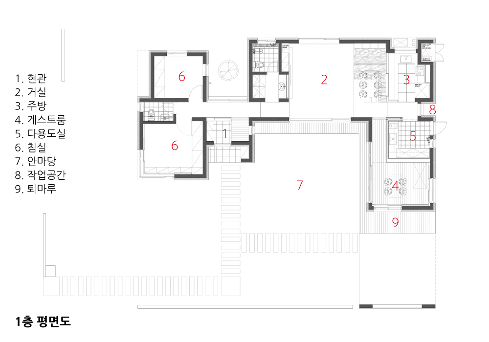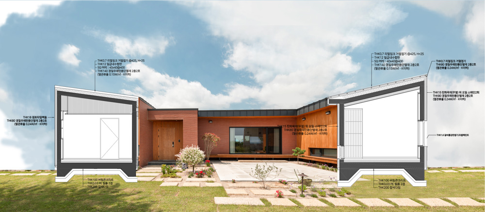 I wanted the house to be in harmony with the surroundings rather than revealing itself in a rural village. Therefore, it is a simple mass segmentation and a straightforward slanted roof. ‘Hwadam Byeolseo’ was named by the client, whereas ‘Moeumjib(gathering)’ was given by Ilsang Architects. The layout of the building was also focused on the yard. The house was built together with the hearts and devotions of the parents and their two sons.