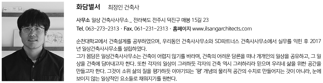 시골마을에 들어서는 집이 제 모습을 드러내기보단 주변과 조화롭길 바랐다. 심플한 매스, 매스의 분절, 간결한 사선 지붕으로 이루어진 주택이다. ‘화담별서’는 건축주가 지은 이름이고, 일상건축이 지은 이름은 ‘모음집’이었다. 건물의 배치도 마당을 향해 모이고, 부모님과 두 명의 아들들의 마음과 정성이 모여서 만들어진 집이어서 모음집이라 이름 지었다.