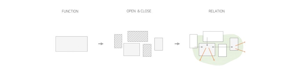 한옥의 마당에 서서 바라보이는 처마가 모여지는 부분이 주는 위요감, 안락함에서 건물의 디자인이 시작되었다. 외부에서 보이는 형태도 중요하지만, 그 공간에서 살아가는 사람들이 느끼는 시선과 공간감을 우선시했다. 집에서 느낄 수 있는 편안함, 공간의 크기, 시야의 확장, 빛의 밝기….
