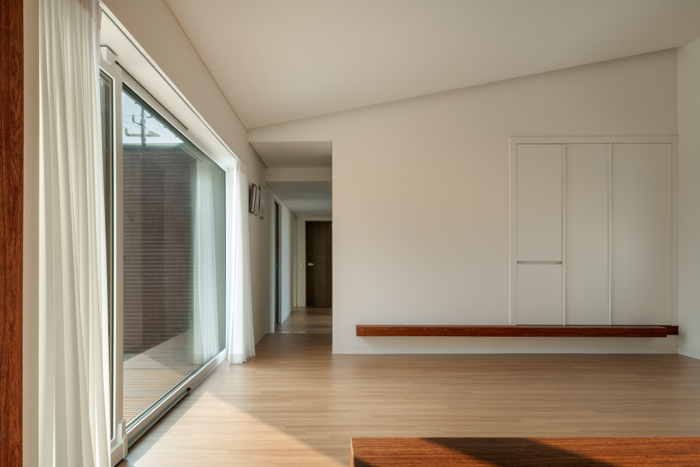 거실에서 바라보는 풍경은 게스트룸 매스로 인해 작업공간을 가려주어 마당의 조경과 담장 너머로 펼쳐진 시골의 고즈넉한 풍경을 온전히 누리게 해준다. 게스트룸은 아들들을 위한 공간이자, 손님을 맞이하는 공간으로 거실에서 조금 더 거리를 두고자 했다. 한옥의 사랑채와 같다.