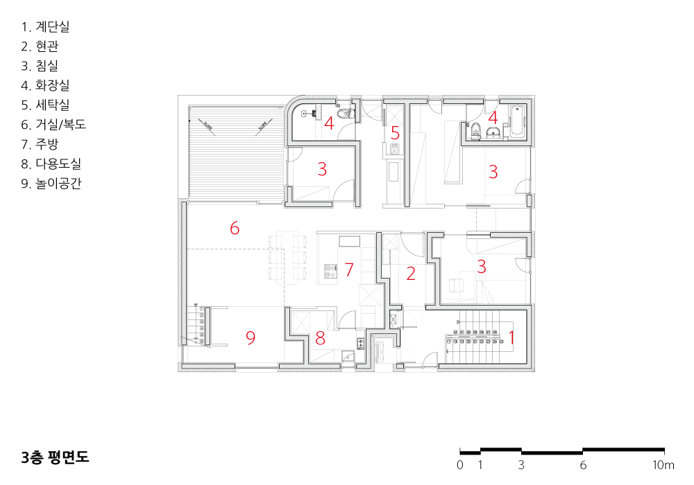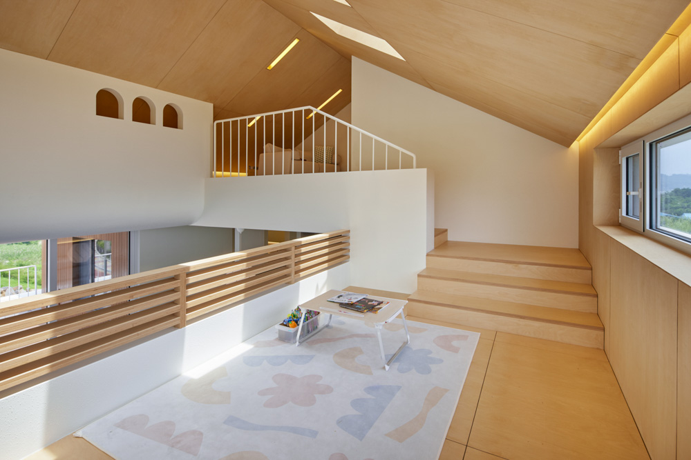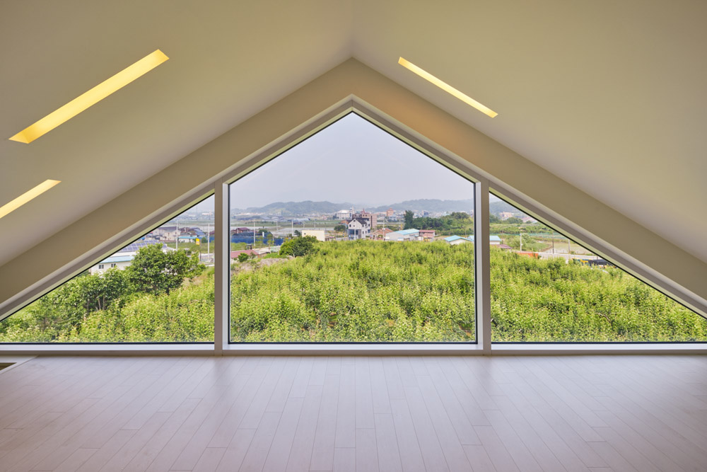 또 주차장 출입구와 동선을 분리하여 주차공간과 진입공간의 개방감과 쾌적성을 높였다. 뒤편 배밭을 바라보는 계단실은 이동의 기능만을 갖는 공간이 아닌 조망을 위한 감상의 공간이 되었다.