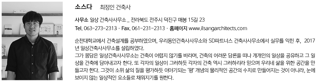 | 소스다 설계자 | 최정인 _ 일상 건축사사무소 감리자 | 최정인 _ 일상 건축사사무소 시공사 | 두영종합건설 설계팀 | 김헌, 주유나 설계의도 구현 | 일상 건축사사무소 대지위치 | 전라북도 전주시 덕진구 송천동 2가 주요용도 | 상가주택 대지면적 | 279.50㎡ 건축면적 | 166.11㎡ 연면적 | 370.62㎡ 건폐율 | 59.43% 용적률 | 132.60% 규모 | 3층 구조 | 철근콘크리트구조 외부마감재 | 1층 _ STO시그니쳐 linear10 / 2층, 3층 _ 아이코트 료와 안센트 타일 / 3층일부 _ 이페 / 지붕 _ 에코렉스 내부마감재 | 마모륨, STO, 자작나무합판 설계기간 | 2019. 11 – 2020. 04 공사기간 | 2020. 05 – 2020. 12 사진 | 노경 전문기술협력 - 구조분야 : 시너지구조 - 기계설비분야 : (주)GM엔지니어링 - 전기분야 : (주)GM엔지니어링 |