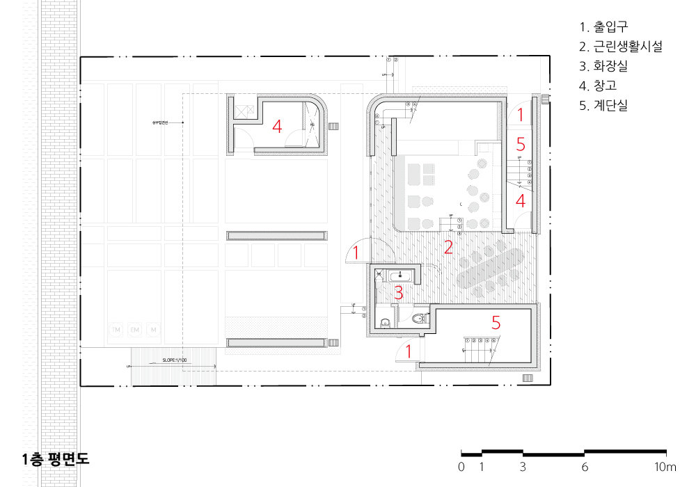 소스다는 계단실이 두 개, 즉 임대세대의 전용면적이 줄어드는 평면을 가지고 있다. 계단실이 두 개이니 1층 메인현관 역시 두 개가 된다. 임대세대에서 생활하게 될 이들이 1층 현관부터 나의 공간이라는 생각을 가질 수 있도록 하여 조금 더 편안하게 집을 드나들 수 있도록 했고, 주인세대와의 동선 겹침으로 발생할 수 있는 불편한 상황을 만들지 않고자 했다.