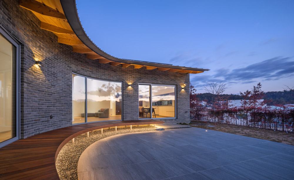 특이한 조형감이 다소 생소할 수 있지만 중정처럼 어느 정도 테두리가 있는 아늑한 마당을 가지면서 풍경을 깊숙하게 끌고 오기에는 충분한 형태였다. 곡선 형태를 목구조로 구현하면서 만들어진 곡선 처마는 자연으로 몰입하게 만들기도 한다. 동그란 집으로 둘러싸인 동그란 마당은 산의 풍경을 담기도 하고 가족 구성원들만의 풍경을 담기도 한다.