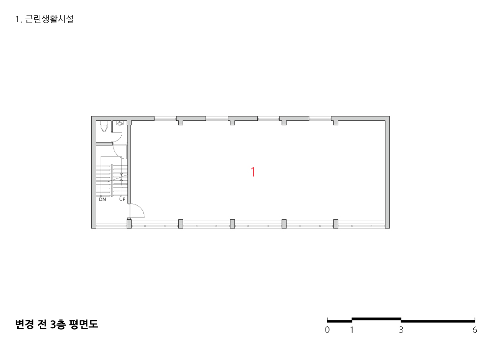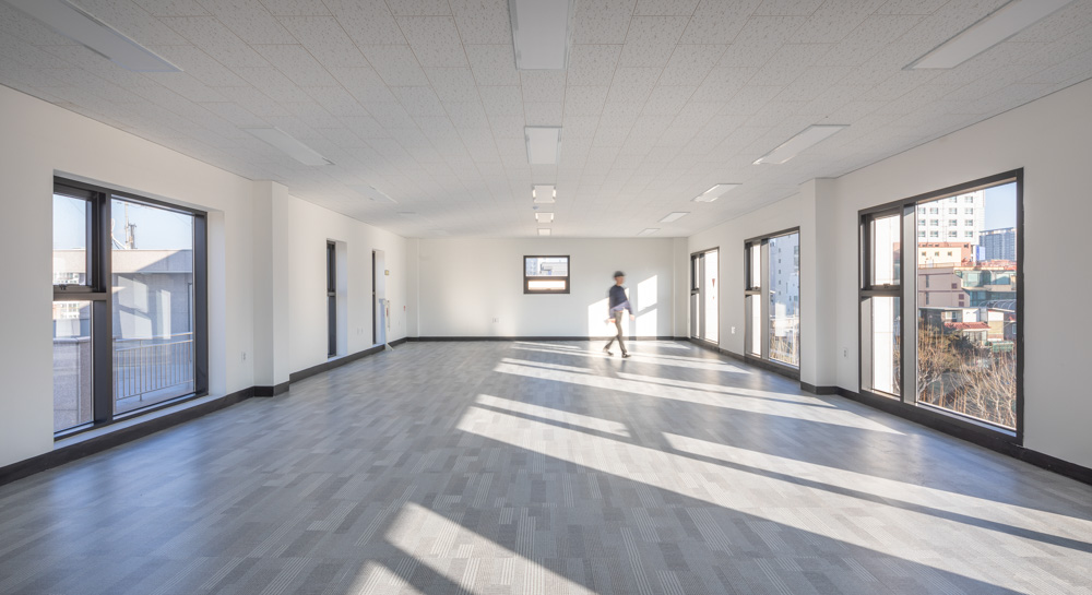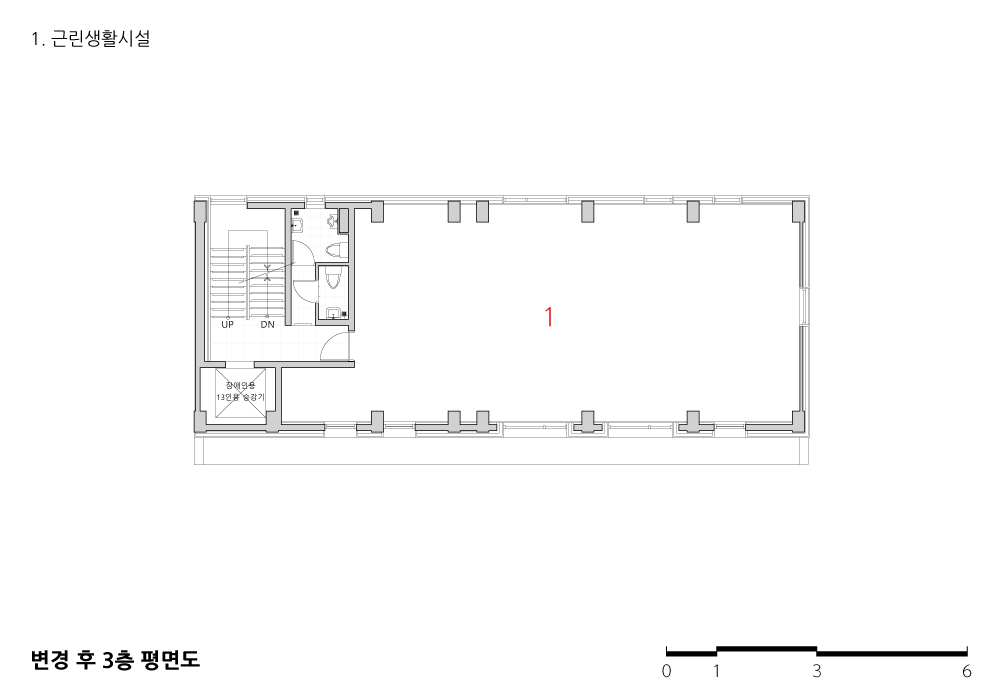 3층 규모의 건물을 5층으로 수직증축하고 엘리베이터를 신설하는 것이 주요한 계획 목표였다. 이 건물의 경우 기존 계단실과 화장실을 유지한 상태에서는 엘리베이터 신설 위치가 적당하지 않아 부득이 기존의 계단과 화장실을 철거하고 엘리베이터와 계단을 새로 계획하였다. 또 성별이 구분되는 화장실을 기존의 전용공간에 계획하였다.
