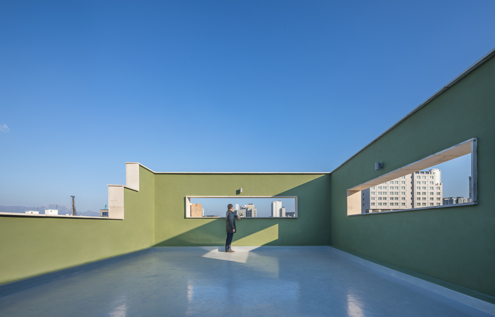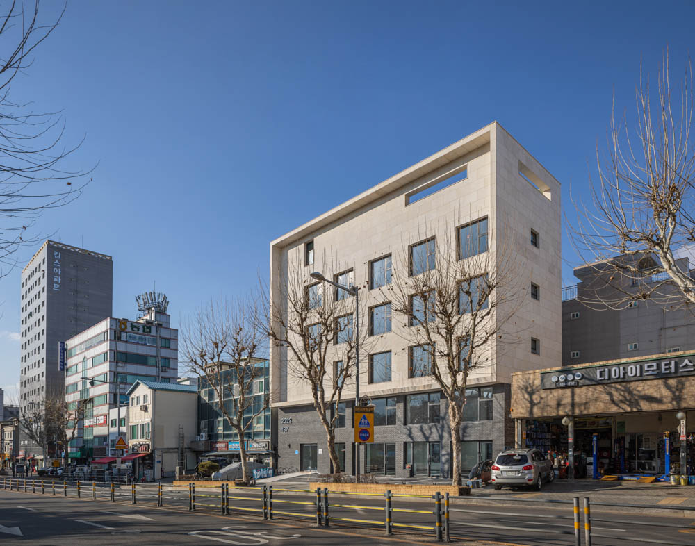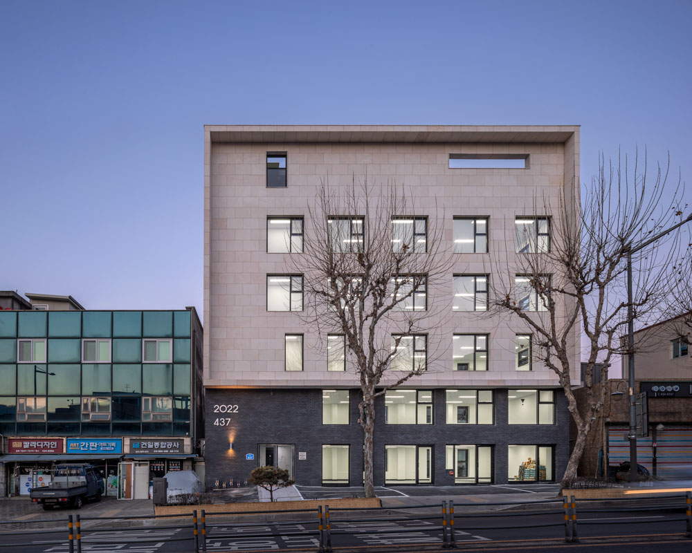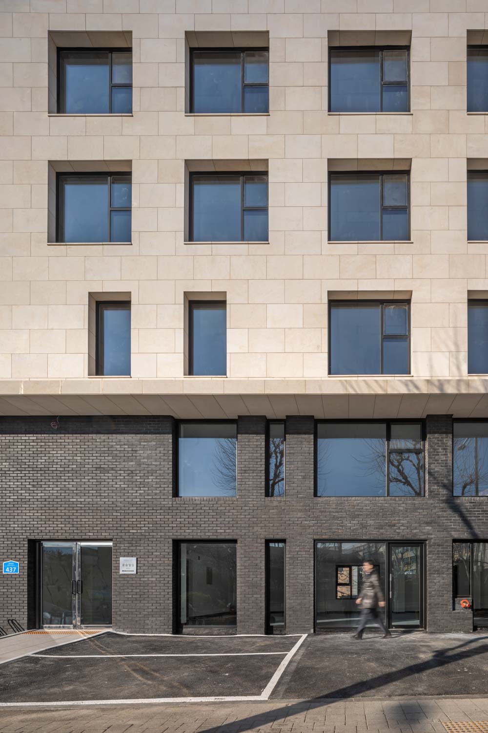 Bright and soft materials as much as possible are selected for the exterior of the building to utilize the features of the site that can fully receive the morning sunshine. Limestone-based finishing materials were selected. Because limestone has a strength that is not that high and white-based finishing material, and has the risk of destruction or pollution on the lower floors, the lower floors are finished with black clay bricks.