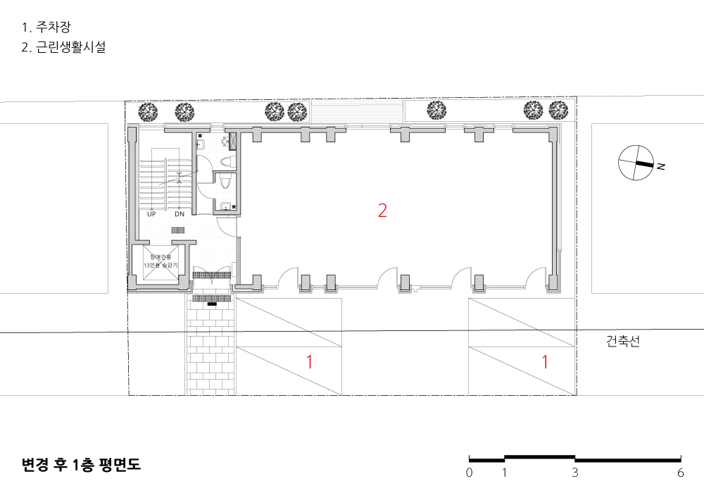 The critical plan is to vertically extend three stories building to 5 stories and build the elevator. In this building, the elevator's location is not proper when the existing staircase and toilets remain, the existing staircase and bathrooms are inevitably demolished, and the elevator and the stairs are newly planned. In addition, the gender-separated toilet was planned in the existing exclusive space.