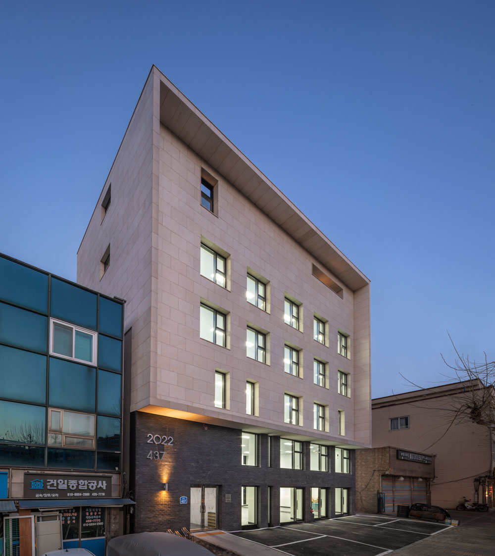 In the front, a giant framed structure is established. I intended to express the change of shadow overtime on the main elevation of the building depending on the change of sunshine. The numbers 2022 and 437 are installed on the black clay brick, and they are symbolic signs intuitively expressing the time and the space in which this building is located. That is, they intuitively represent the spatiotemporal identity of the building.