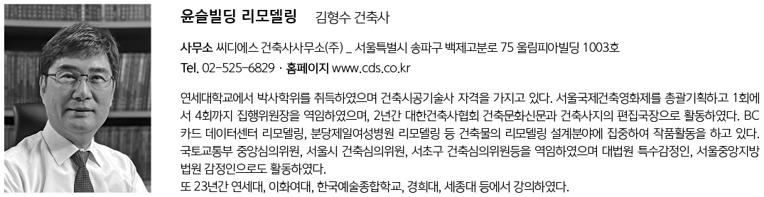 | 윤슬빌딩 리모델링 설계자 | 김형수 _ 씨디에스 건축사사무소(주) 건축주 | 리모빌드 감리자 | 김형수 _ 씨디에스 건축사사무소(주) 시공사 | 주식회사 대승아키종합건설 설계팀 | 김수현, 김민채, 김동현 설계의도 구현 | 김형수_ 씨디에스 건축사사무소(주) 대지위치 | 서울특별시 중랑구 면목로 437 주요용도 | 근린생활시설 대지면적 | 293.70㎡ (기존 : 438.05㎡) 건축면적 | 145.26㎡ 연면적 | 935.04㎡ 건폐율 | 49.45% (기존 : 49.71%) 용적률 | 247.29% (기존 : 149.13%) 규모 | 지하 1층 - 지상 5층 (기존 : 지하 1층 - 지상 3층) 구조 | 철근콘크리트구조 외부마감재 | 라임스톤, 전벽돌 내부마감재 | 무늬타일, 수성페이트, 데코타일 설계기간 | 2020. 11 – 2021. 04 공사기간 | 2021. 04 – 2022. 02 사진 | 윤준환 전문기술협력 - 구조분야 : (주)한국재해예방기술원 - 기계설비분야 : (주)삼정이엔씨건축사사무소 - 전기통신분야 : (주)한양전력기술사사무소 - 소방분야 : 서림방재기술(주) |