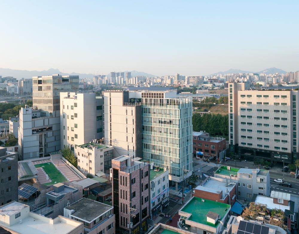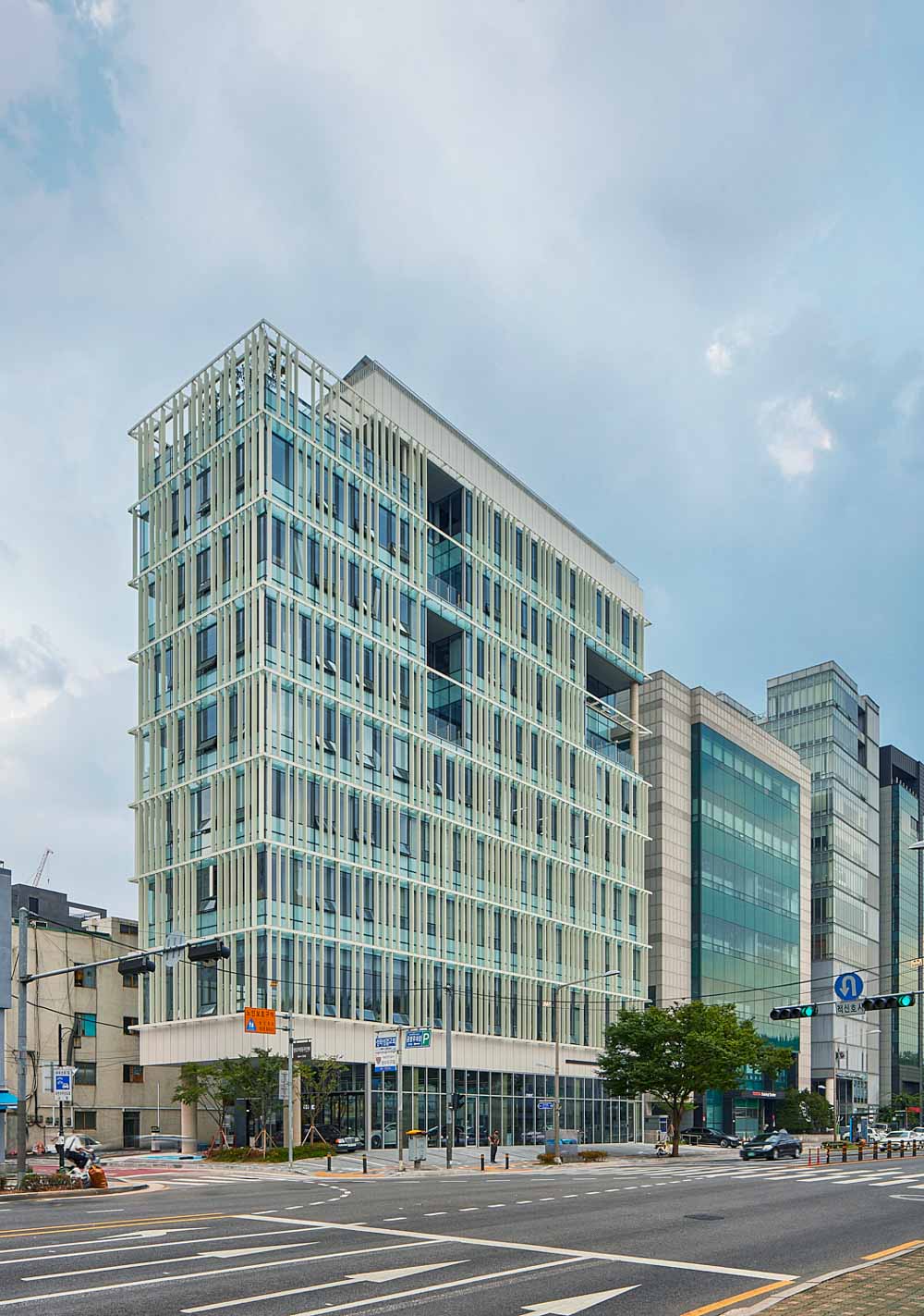 Located on the corner site where Achasan-ro 7-gil, which connects from the Seongsu Station to the north, meets Gwangnaru-ro, The site has a quite spectacular open view to the north beyond Jungnangcheon Stream with Songjeong Embankment Park to Dapsimni and faces the typical small block context of Seongsu-dong to the south. The main elevation of the building with a square proportion responses to the essential frontality as an office building, floats one level above the street. The partially segmented terraces on the upper levels give vitality to the elevation, functioning as an exterior spaces with open views to the north.
