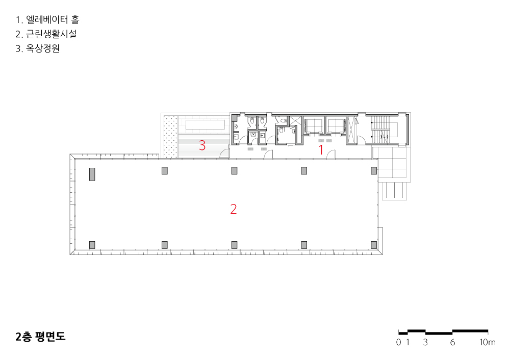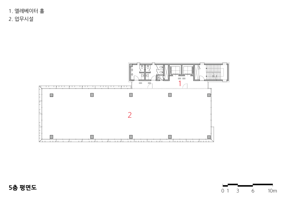 건물의 매스는 크고 작은 두 매스의 조합으로 구성되는데 남측에 위치한 작은 매스는 계단실, 화장실, 엘리베이터를 하나로 묶은 편심코어매스로 루이스 칸이 말하는 ‘servant space’로 기능하며, 이의 지원을 받는 ‘served space’인 북측의 큰 매스는 업무공간으로 기능한다. 이러한 두 매스의 확실한 기능적 분절은 편심코어매스의 솔리드한 스킨과 업무공간매스의 보이드한 유리커튼월로서 그 대비가 강조되며, 이 둘 사이의 전이공간으로서 최소한의 공용공간이 복도로 존재하여, 대비되는 두 솔리드 보이드 매스의 간극을 형성한다.