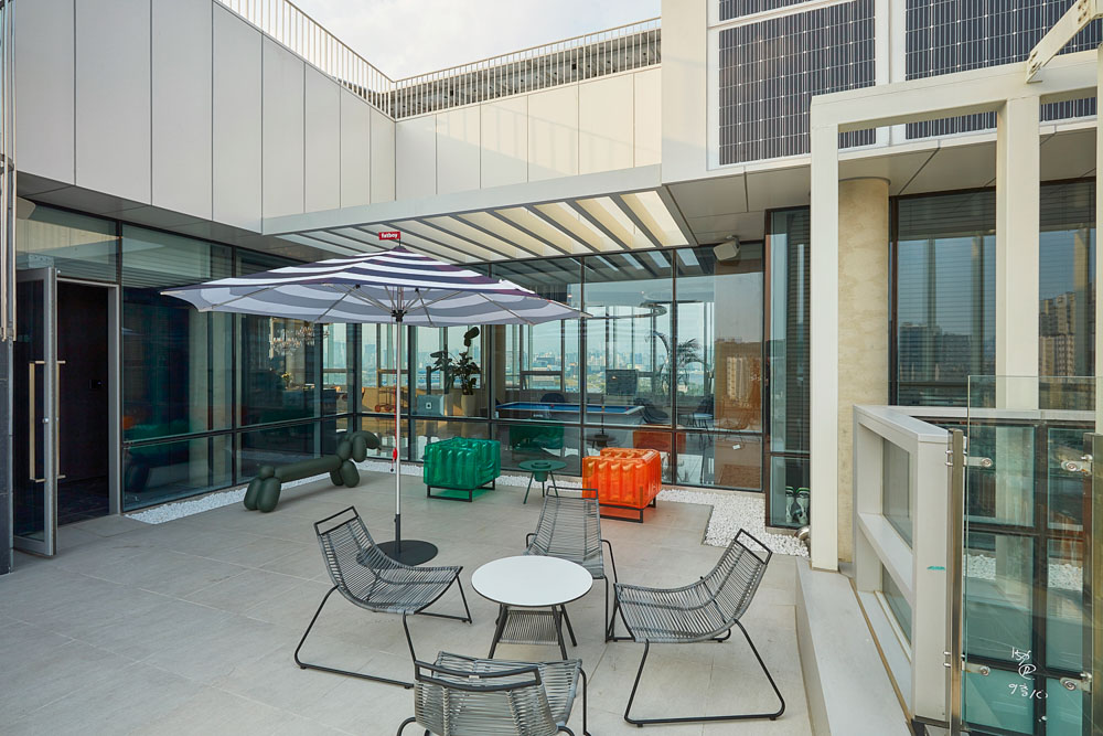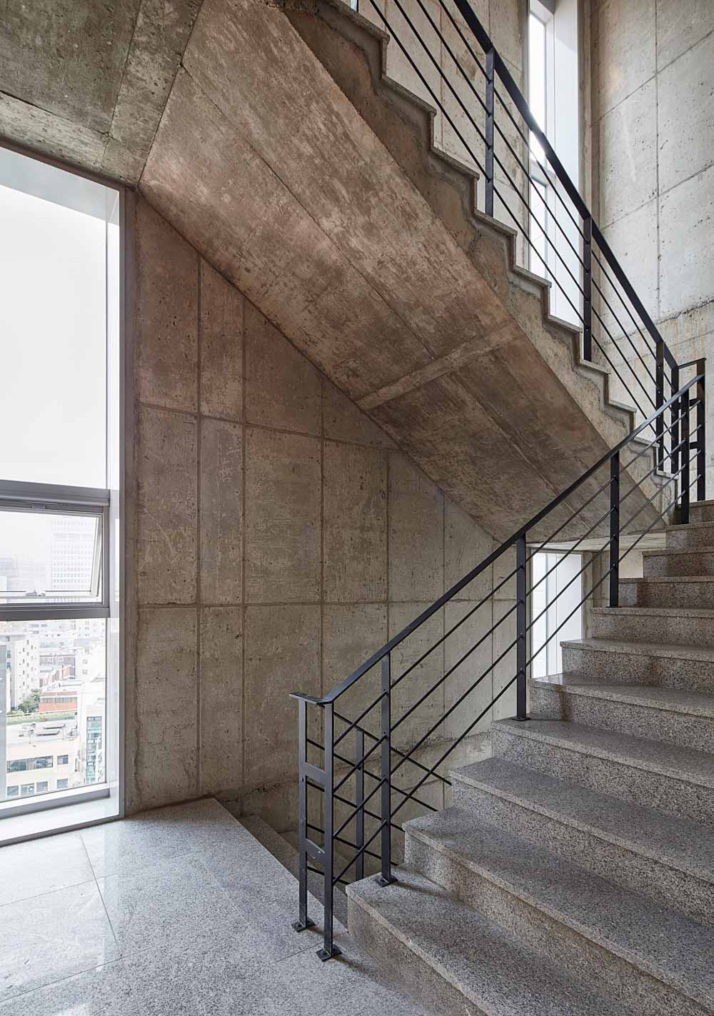 The massing of the building consists of two masses, One small volume, an eccentric core, located in the south, functioning as the "servant space" as Louis Khan said, and the other large volume, a workspace, functioning as the "served space". The clear functional separation of these two masses emphasizes the contrast as the solid skin of the eccentric core mass and the void glass curtain wall of the workspace mass, and a minimum common space exists as a transition space between the two, forming a gap between the two volumes.