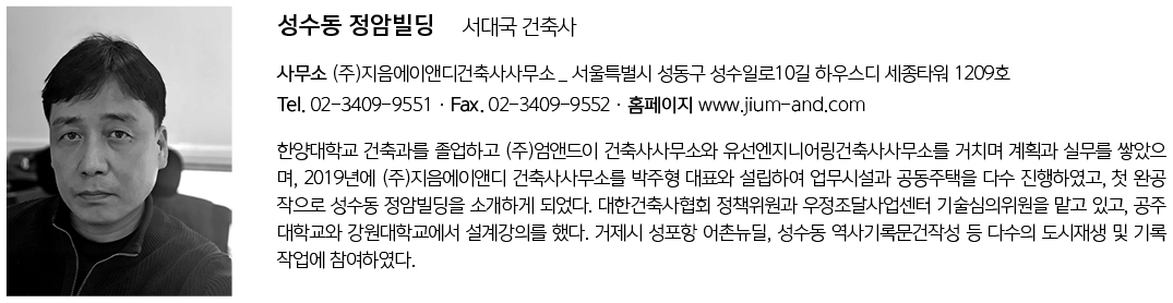 | 성수동 정암빌딩 설계자 | 서대국 _ (주)지음에이앤디건축사사무소 공동설계자 | 서규덕 _ 강원대학교 건축학과 교수 AIA(미국건축사) 건축주 | 내포레미콘 감리자 | 서대국 _ (주)지음에이앤디건축사사무소 시공사 | (주)마루디자인건설 설계팀 | 박주형, 한재인, 손지욱, 정지범 설계의도 구현 | 서대국 _ (주)지음에이앤디건축사사무소 대지위치 | 서울특별시 성동구 광나루로 232 주요용도 | 업무시설 / 근린생활시설 대지면적 | 905.50㎡ 건축면적 | 488.20㎡ 연면적 | 4,746.48㎡ 건폐율 | 53.91% 용적률 | 395.44% 규모 | 지하 2층 - 지상 9층 구조 | 철근콘크리트구조 외부마감재 | 3T 알루미늄루버, 26T 강화복층유리 설계기간 | 2019. 01 – 2020. 03 공사기간 | 2020. 05 – 2021. 07 사진 | 박건주 전문기술협력 - 구조분야 : (주)이건구조 - 기계설비분야 : (주)맥앤드엠이씨 - 전기분야 : (주)서원이엔지 - 소방분야 : (주)맥앤드엠이씨, (주)서원이엔지 |