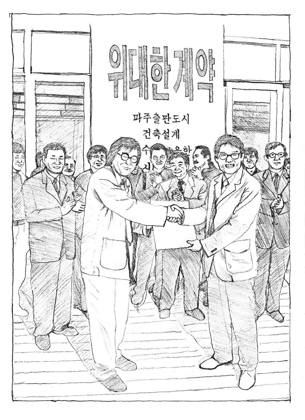 김종신_처음부터 저희가 의도한 건 아니었지만 한국의 현대사와 맞물려 가는 부분이 있었던 것 같아요. 1970년대 중후반부터 1980년대에 걸쳐서 출판인들이 감시의 대상이 되기도 하고 마르크스의 자본론 같은… 이른바 금서를 만들면 구속되던 시절이 있었잖아요. 그러던 출판인들의 꿈이 건축사들과의 위대한 계약을 통해 1998년에 현실로 이뤄졌고요. 한국 현대사와도 맞물려 보이는 그런 부분을 좀 전달하고 싶었어요. 한국 현대사 속에서 이런 특별한 도시를 만들었던 사람들의 노력과 결국 어떤 도시가 만들어졌는지에 대한 이야기 속 균형을 맞추려 했습니다.