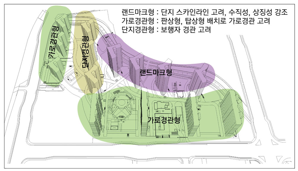 - 단지경관형 : 보행자 경관을 고려하여 단지 내부에 위치하는 배치계획