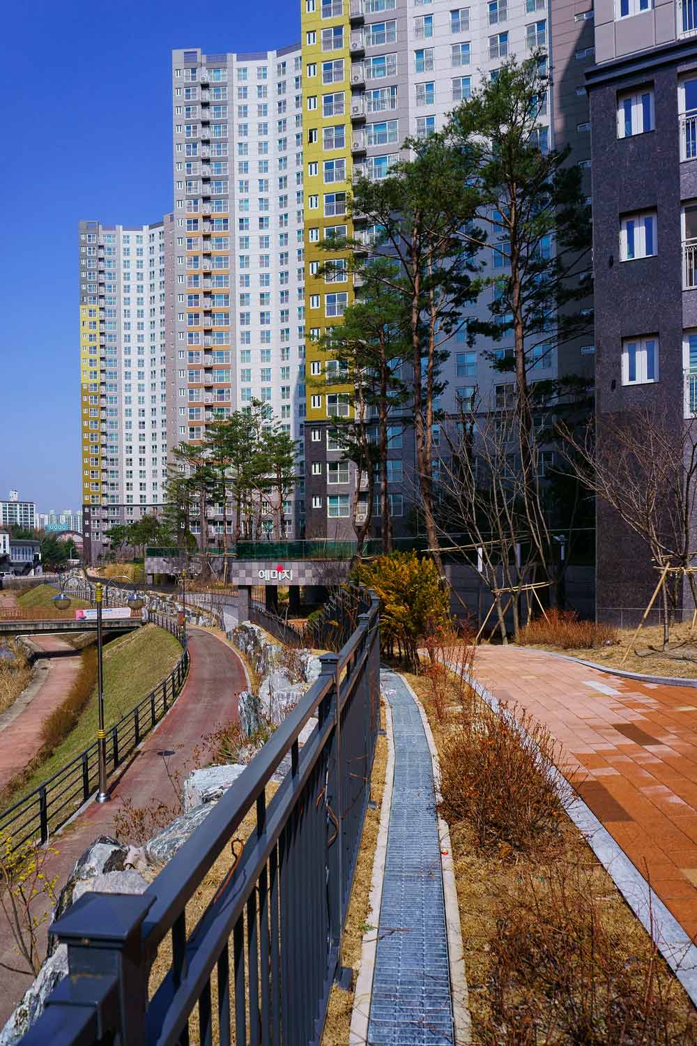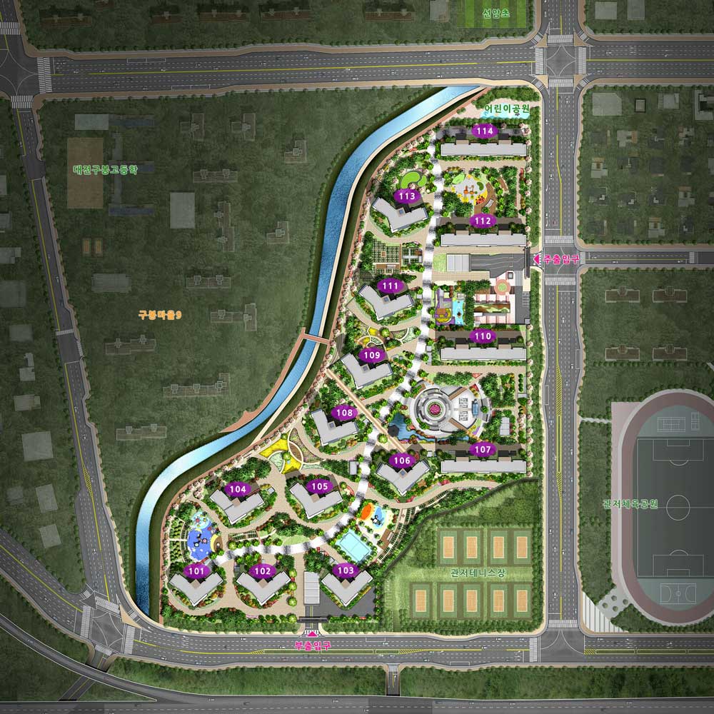 - Introduce the beautiful scenery of Mt. Gubong on the South, and create various forms of the buildings along the stream on the West and a walking space connected with the waterfront park