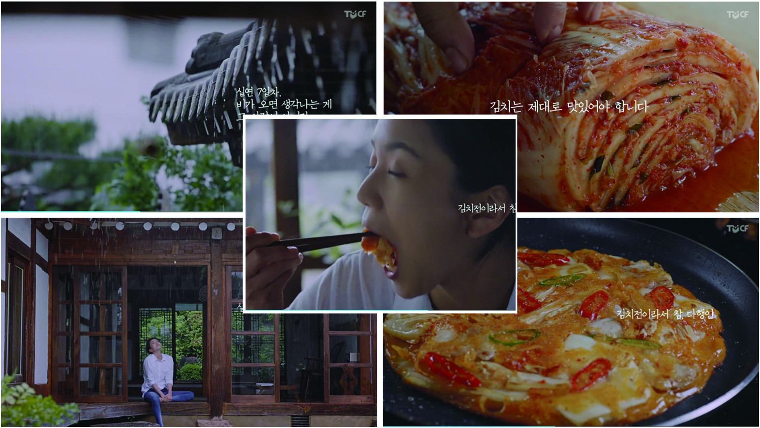 (젊은 여자가 툇마루에 앉아 비가 내리는 마당을 쳐다보고 있다. 쏴아아- 빗소리가 소란하고 젖은 기와 처마에 매달린 풍경이 댕그랑 소리를 낸다. 치지직 김치전 부치는 모습이 보인 뒤, 여자가 김치전을 맛있게 먹는다.)