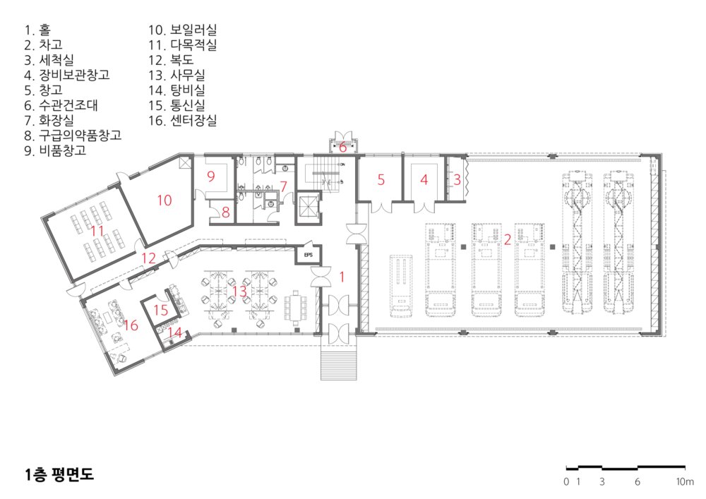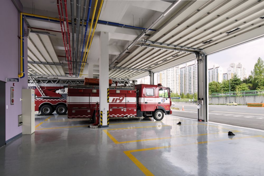 Guam Fire House Architect | Kim, Yongkak _ KYK Architects & Planners Client | Daejeon Metropolitan City Supervisor | Kim,Younwook _ Dodam Architects Construction | Onepyong Construction Inc. Project team | Oh, Sunmi / Lee, Kidong / Kim, Min / Park, Minkyu Location | 263, World Cup-daero, Yuseong-gu, Daejeon, Korea Program | Public service facilities Site area | 2,569.00㎡ Building area | 748.11㎡ Gross floor area | 1,288.14㎡ Building to land ratio | 29.12% Floor area ratio | 50.14% Building scope | 3F Structure | RC Exterior finishing | Granite stone, Wind pressure _ Board insulation Interior finishing | Eco-friendly water paint , Granite stone _ Honed Finishing Design period | Oct. 2013 ~ Mar. 2014 Construction period | Jan. 2015 ~ Feb. 2016 Photograph | Yang, Woosang Structural engineer | Jayeon Structural Engineering Mechanical engineer | Ace Professional Engineer Company Electrical engineer | HK Engineering Fire engineer | Narea Engineering |