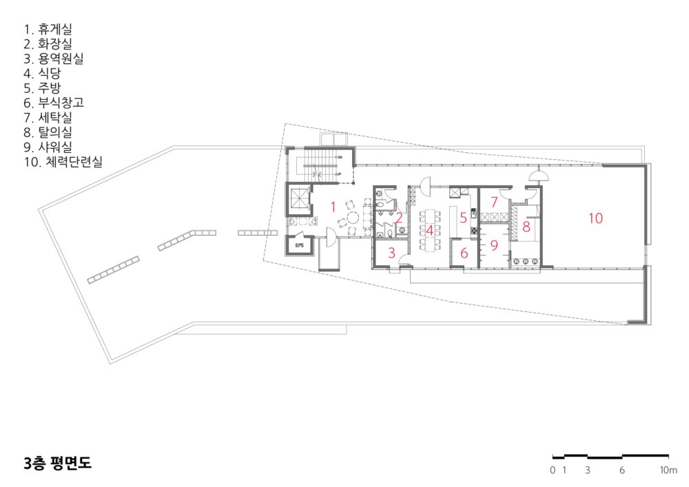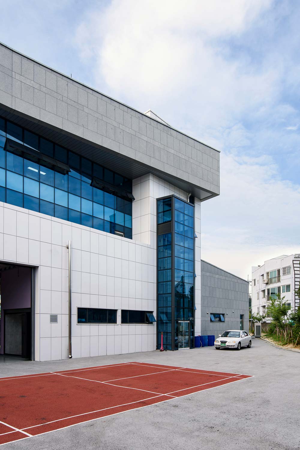 I tried to break out the uniform and monotonous shape of the fire station as a public office and suggest a possibility of a small government office through new symbolism and form. The exterior, composed with achromatic stones and boards, has significant contrast to the intensly highlighted red color and pointed out the landmark's symbolism.