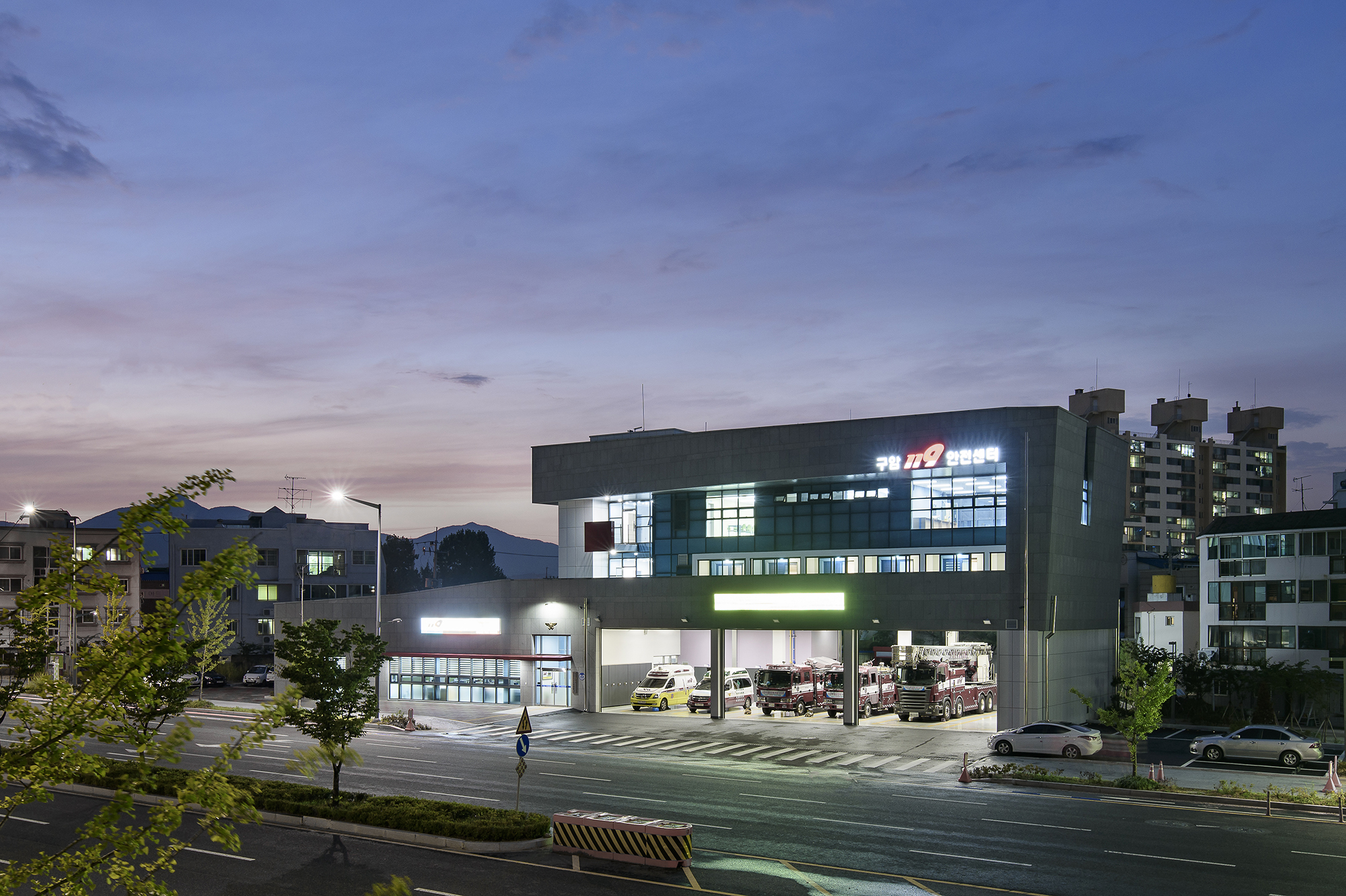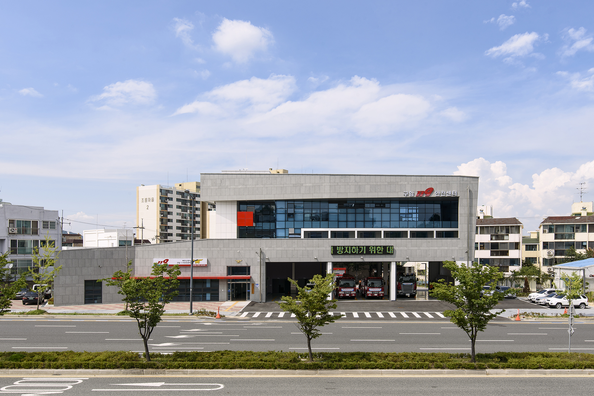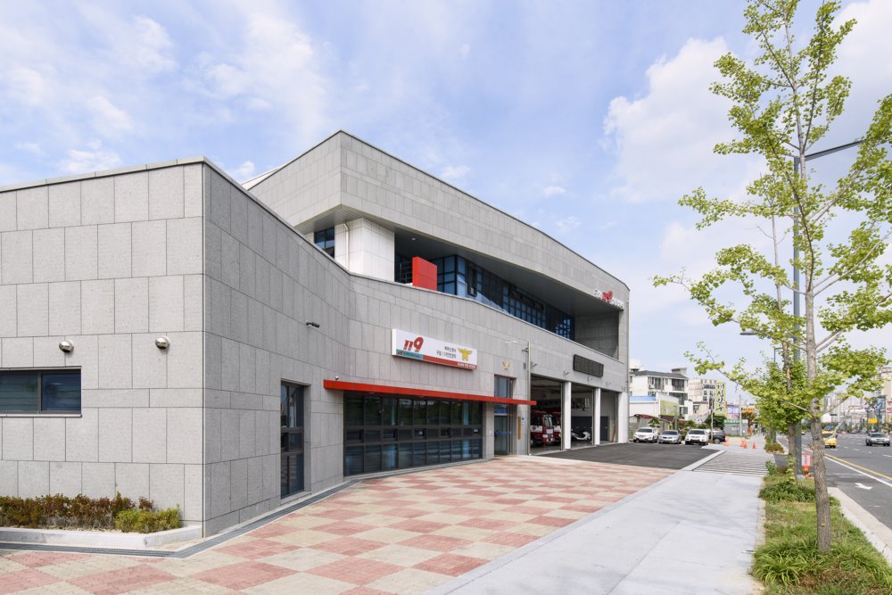 | 구암 119 안전센터 설계자 ┃ 김용각 KIRA ┃ 김용각 건축사사무소 건축주 | 대전광역시 감리자 | 김연욱 _ 도담 건축사사무소 시공사 | 주식회사 원평종합건설 설계팀 | 오선미, 이기동, 김민, 박민규 대지위치 | 대전광역시 유성구 월드컵대로 263 주요용도 | 공공업무시설 대지면적 | 2,569.00㎡ 건축면적 | 748.11㎡ 연면적 | 1,288.14㎡ 건폐율 | 29.12% 용적률 | 50.14% 규모 | 지상 3층 구조 | 철근콘크리트조 외부마감재 | 고흥석, 내풍압단열보드 내부마감재 | 친환경수성페인트, 화강석물갈기 설계기간 | 2013. 10 ~ 2014. 03 공사기간 | 2015. 01 ~ 2016. 02 사진 | 양우상 구조분야 : 자연구조기술사사무소 기계설비분야 : 에이펙엔지니어링 전기분야 : HK엔지니어링 소방분야 : 나래엔지니어링 |