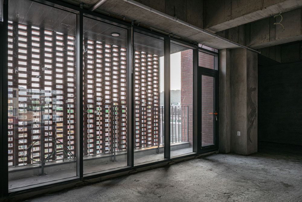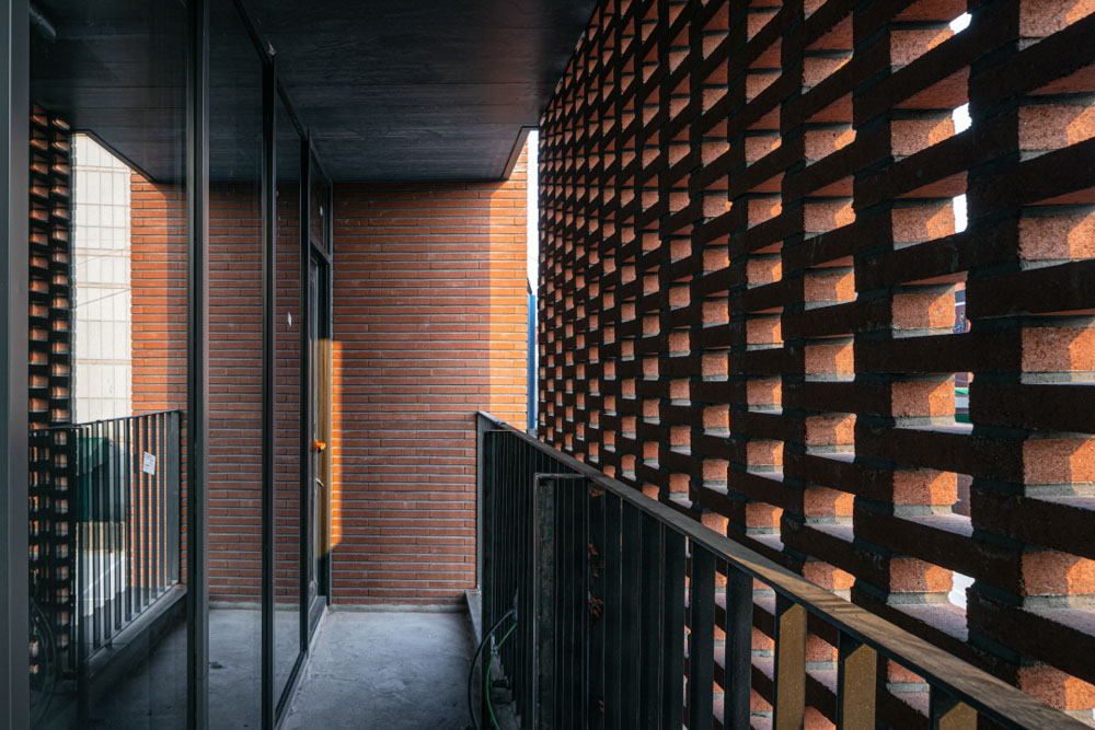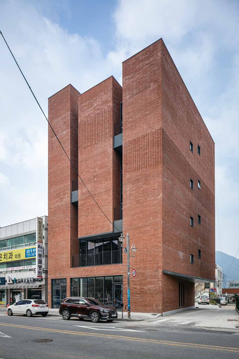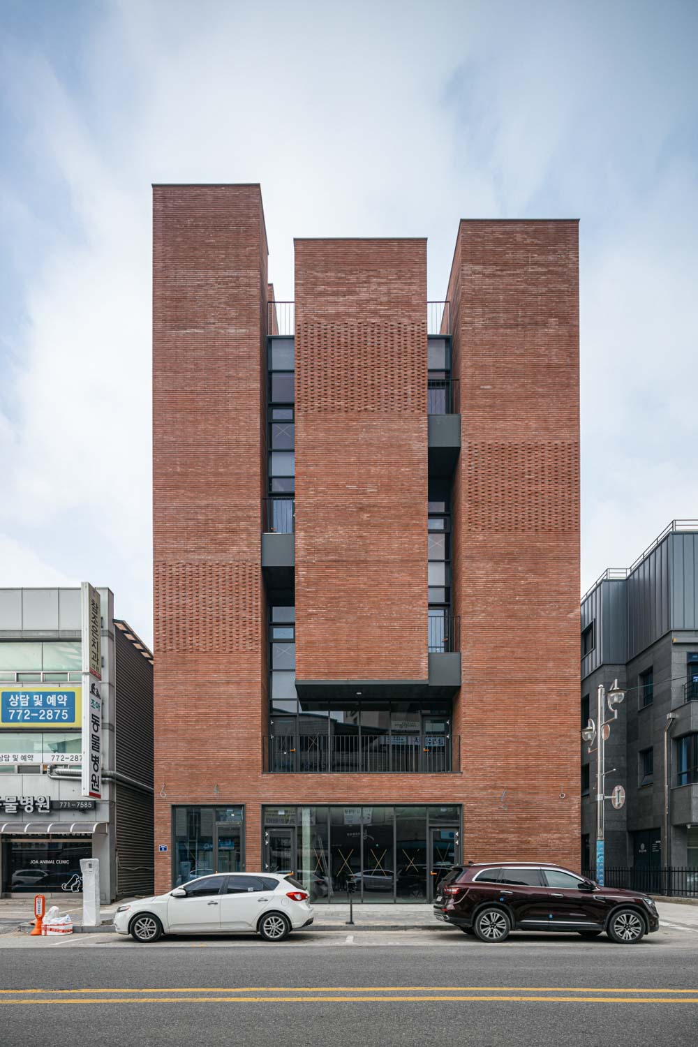 각 층별로 벽돌을 돌려쌓아 일조에 따른 건물의 입체감을 주었으며, 공간쌓기 한 벽돌 벽체 사이로 햇빛과 조명이 다양하게 연출되도록 입면을 디자인하였다. 특히 각 층별 다양한 형태의 테라스는 상가공간에 외부와의 접점을 만들었고, 임대상가에서 부족할 수 있는 개방감은 테라스로 보완하여 단조로울 수 있는 공간에 변화를 줬다.