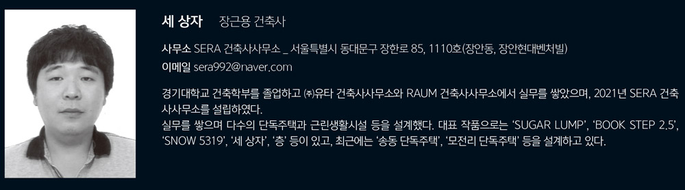 Three boxes Architect | Bang, Jaewoong · Jang, Geunyong · Kwon, Hyukchul_SERA architecture RAUM architecture Client | Yongmun MG Saemaul Geumgo Supervisor | Sambo architecture Construction | Wooryung construction Design intention realization | Location | 5, Damunjungang 1-gil, Yongmun-myeon, Yangpyeong-gun, Gyeonggi-do, Korea Program | Neighbour-hood facility Site area | 1,066.00㎡ Building area | 214.48㎡ Gross floor area | 999.92㎡ Building to land ratio | 20.12% Floor area ratio | 93.80% Building scope | 5F Structure | RC Exterior finishing | Brick(durastack S-series) Design period | 2020. 03 – 2020. 07 Construction period | 2020. 08 – 2021. 07 Photograph | Yoon, Donggyu Structural engineer | Teunteun Structural Engineering Company Mechanical engineer | Woojung E&C Electrical engineer | Codam Engineering Company Fire engineer | Codam Engineering Company |