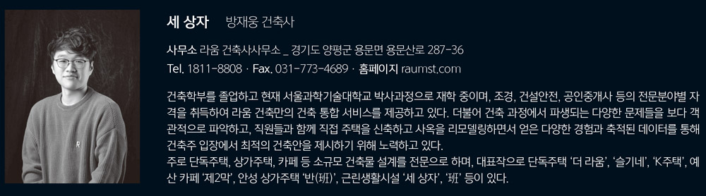 ‘세 상자’는 접근성을 고려해 도로에 면하게 배치하되, 상가의 효율적인 활용을 위해 1층을 제외한 2~5층은 직사각형 형태를 유지할 수 있도록 했으며, 필요 프로그램을 쌓은 직사각형 박스에서 VOID 공간(창호)을 통해 분절하여 세 개의 상자가 책꽂이에 꽂혀있는 디자인이 되었다. 특히 지역 주민과 상생할 수 있도록 1층의 파사드를 희생하지 않는 범위 내에서 주민을 위한 통행로를 개방했다.